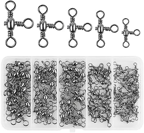 - 【100PCS 3 WAY SWIVELS KIT】Includes 2#:15pcs, 4#:15pcs, 6#:20pcs, 8#:20pcs, 10#:30pcs. Test from 35-82lb. Total 100pcs barrel triple fishing swivels in a reusable box. Multiple sizes to meet your different fishing needs.