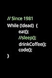 - Since 1981 While !Dead Eat Sleep Drink Coffee Code a 120 pages Notebook featuring Funny Coding and a funny I turn coffee into code since 1981 on a Matte-finish cover.Perfect gift for parents, grandparents, kids, boys, girls, youth and teens as a Programmer journal gift. 120 pages6"x9"White-color paperMatte Finish Cover for an elegant look and feel Are you a Programmer ? Do you love Coffee? Are you looking for a gift for your parents or relatives who work as Developer and love coding ? Then you need to buy this gift for your brother, sister, Auntie and celebrate their birthday. Are you looking for a Funny Programmer Gift ? Programmer journal ? Programmer Notebook ? Then click on our brand and check the hundreds more custom options and top designs in our shop!