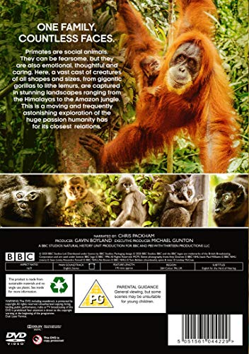 ONE FAMILY, COUNTLESS FACES. Primates are social animals. They can be fearsome, but they are also emotional, thoughtful and caring. Here, a vast cast of creatures of all shapes and sizes, from gigantic gorillas to lithe lemurs, are captured in stunning landscapes ranging from the Himalayas to the Amazon jungle. This is a moving and frequently astonishing exploration of the huge passion humanity has for its closest relations. Narrated by Chris Packham (Springwatch) Producer Gavin Boyland (Big Cats) Executive Producer Michael Gunton (Planet Earth II, Dynasties) This product’s case and sleeve are made from sustainable materials, without single use plastic: • Card and paper are FSC certified • Cases are made of recyclable Polypropylene (PP) containing 40% recycled plastic • Inks are water based • We have removed shrink wrap