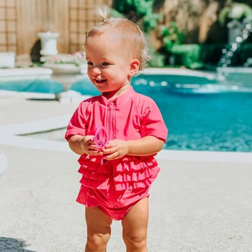 Does your little lady love to dance around in her tutus? Our Ruffle Me Pretty SwimZip is the perfect way to let her dance and jump through the sprinklers in princess style. SwimZip offers the best girls UPF 50+ ruffle Short Sleeve Rash guard swimsuit set with UV sun protection. Get the best sun protection coverage with our girl short sleeve rashguard swim shirt. Our award winning swimwear designs are full of thoughtful features to make this your girl's favorite swimsuit. Features include: SPF 50+ (called UPF 50+ for fabric) UV sun protection material blocking 98% of UVA and UVB sun rays, full length zipper making this the easiest rash guard swim shirt to put on (no more yanking a tight wet rash guard over pony tails and pig tails, just slip our shirt on like a jacket!), zipper garage to prevent chaffing, "no-pinch" zipper flap, and collar for neck sun protection with the sunshirt. SwimZip girl swimsuit designs have been featured on National Television to an audience of over 6 million people. Search SwimZip in the top Amazon.com search bar for related products to pair with this adorable 2 Piece shorts set, like our UPF 50+ UV protective wide brim sun hats, swim shirts, swim skirt cover-ups, and stylish round towels. These swimwear sets are designed for a relaxed fit (not overly tight) and suggest sizing down if in between sizes. Award winning SwimZip UPF 50+ sun protection swimwear is the go-to choice for parents looking best girl swim options. Get your SwimZip today!