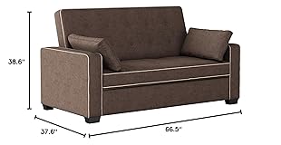 - The Ainsley convertible sofa brings together clean design, smart engineering and craftsmanship in this gorgeous sofa. Built strong, this multi-function sofa transforms into an optional lounger and full size bed making it perfect for the den or guest room. Featuring multi-functional positions, the Ainsley showcases our patented Finger Guard Protection with click & lock technology to avoid injury. This versatile sofa is tufted with high-density foam cushions and Dream Coils wrapped in self stitching upholstery fabric in Java -including two throw pillows- providing a luxurious feel and easy cleaning maintenance. This durable sofa is constructed with kiln dried solid hardwood frame, providing superior structure, stability and support. Treat your guests to the Ainsley’s comfortable bed and they will feel completely rested and energized the next morning. Whether décorating the new guest room or your family den, bring the Ainsley to your home for extra sleeping space and make any weekend a holiday.