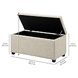 Bench-style storage ottoman in Beige offers a comfortable place to sit; great for an entryway, living room, family room, or bedroom Lift lid to access storage area for books, blankets, shoes, seasonal items, and more; soft close lid with child-safety hinge prevents lid from slamming shut Sturdy hardwood frame with durable plastic feet and fabric upholstery No assembly required Spot clean as needed with a soft, dry cloth Product Dimensions: 16.5 x 35.5 x 17 inches (LxWxH)