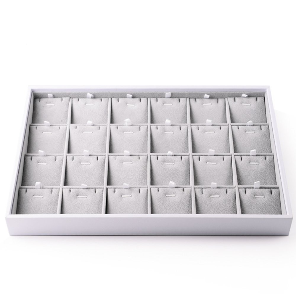 1, SET OF 4: Color: Grey. The set includes 30 Compartment Tray(1 Pack), 24 Compartment Tray(1 Pack), 18 Compartment Tray(1 Pack),12 Compartment Tray(1 Pack), Perfect for earrings, rings, bracelets, necklaces. 2, HIGH QUALITY MATERIAL: Made of high-quality velvet and composite boards, the organizer trays are soft to the touch and elegant in appearance, protecting your jewelry from any kind of damage. 3, MULTI-SECTIONAL: Each tray measures 13.8" x 9.5" x 1.2" inch (LxWxH) and is ideal for storing and displaying your jewelry at home or in the store. You can adjust the size and number of compartments by removing or adding the dividers to meet your personalized storage needs. 4, Stylish Stackable design: Easy to stack and separate, easy to place in a dresser or drawer. To match everywhere like living room, dressing table, store and makeup table. Perfect to organize and display your valuable and important jewelry visibly. 5, VERSATILITY: The jewelry display is great for personal use at home, and perfect for a countertop jewelry display in stores or trade shows. They can also be used to store sewing supplies, home accessories, etc.