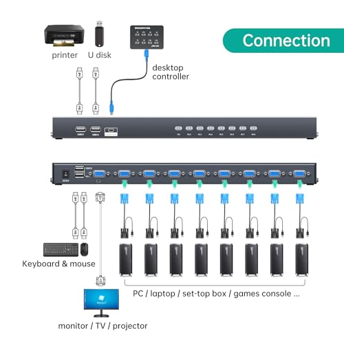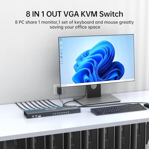 - MT-VIKI 801UK-L, this 8 port KVM switch allows 1 set of USB 2.0 Keyboard & Mouse & monitor to control 8 computers.