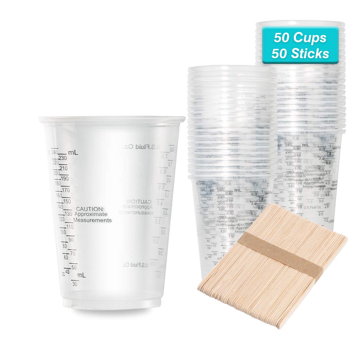 - √ 100pcs Plastic Graduated Cups: Made of improved clean polyethylene, these plastic measuring cups are strong and non-fragile and has easy-to-read external measurements. These reusable disposable clear plastic measuring cups set come per pack of 100 graduated measurement cups for measuring and mixing paint, stain, epoxy, resin and more. Inexpensive enough to be disposable.