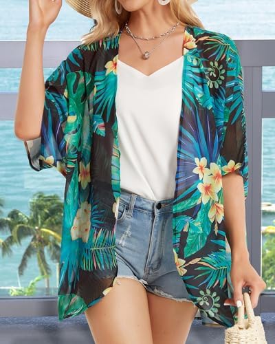 Women's Floral Print Puff Sleeve Kimono Cardigan Loose Cover Up Casual Blouse Tops