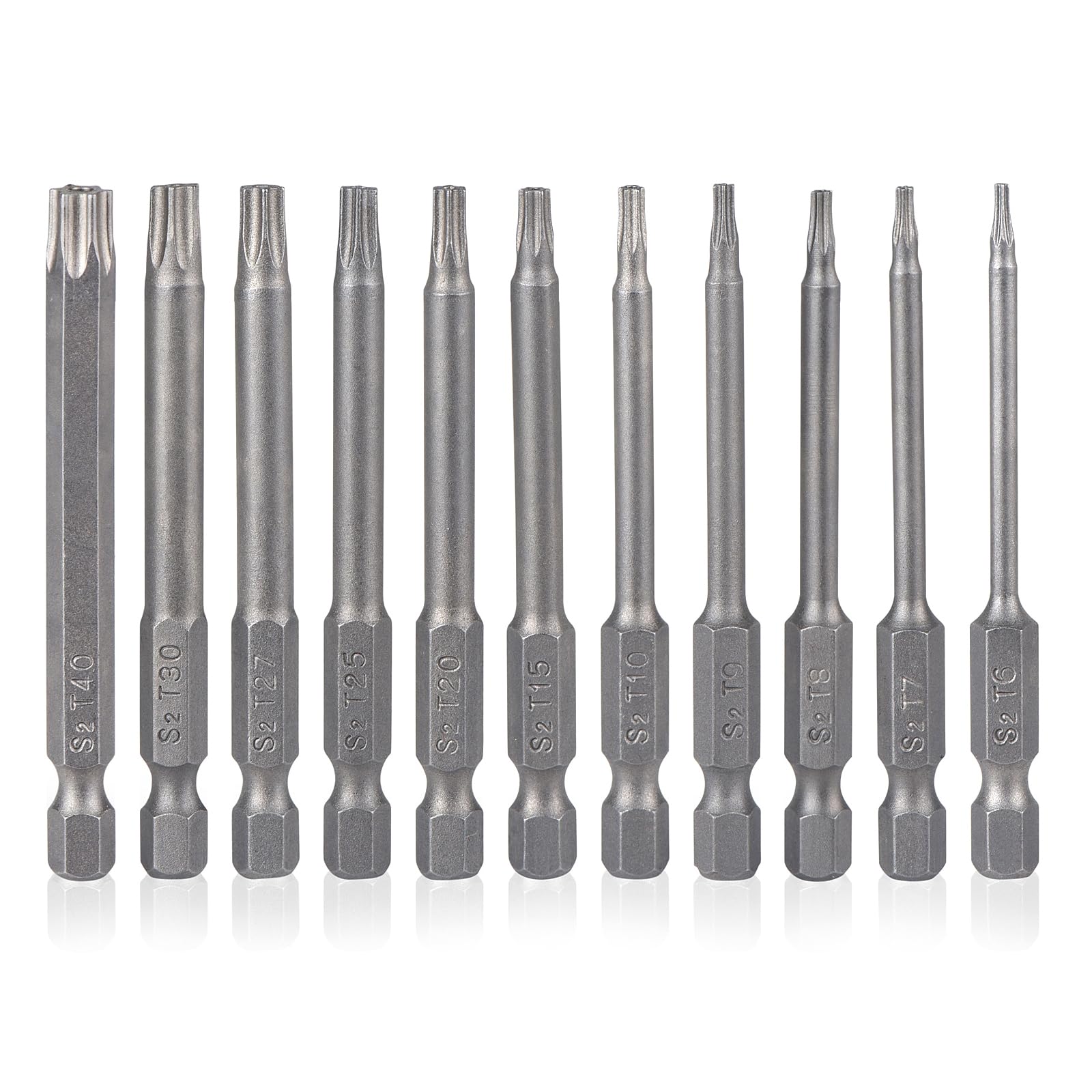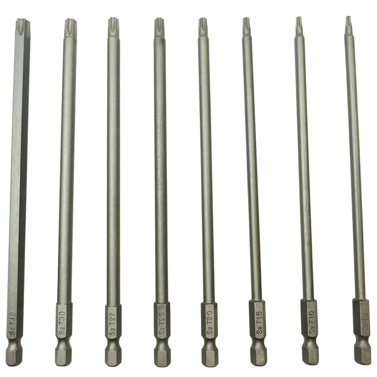 - ✔【8 Size Torx Screwdriver Bits】T8, T10, T15, T20, T25, T27, T30, T40, 8 in 1 Professional Size long torx security driver bits set can meet your different needs. Size is clearly engraved on the shank for easy identification.