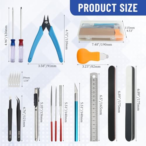 - ✈ FULL RANGE AND COST EFFICIENT: Package include : 1 X Pen knife and 5 X blade; 1 X Separator; 1 X Diagonal pliers; 1 X Steel rule; 2 X Polishing block; 2 X Screwdriver; 3 X Files; 2 X Tweezers;1 X Knife;1 X Plastic box