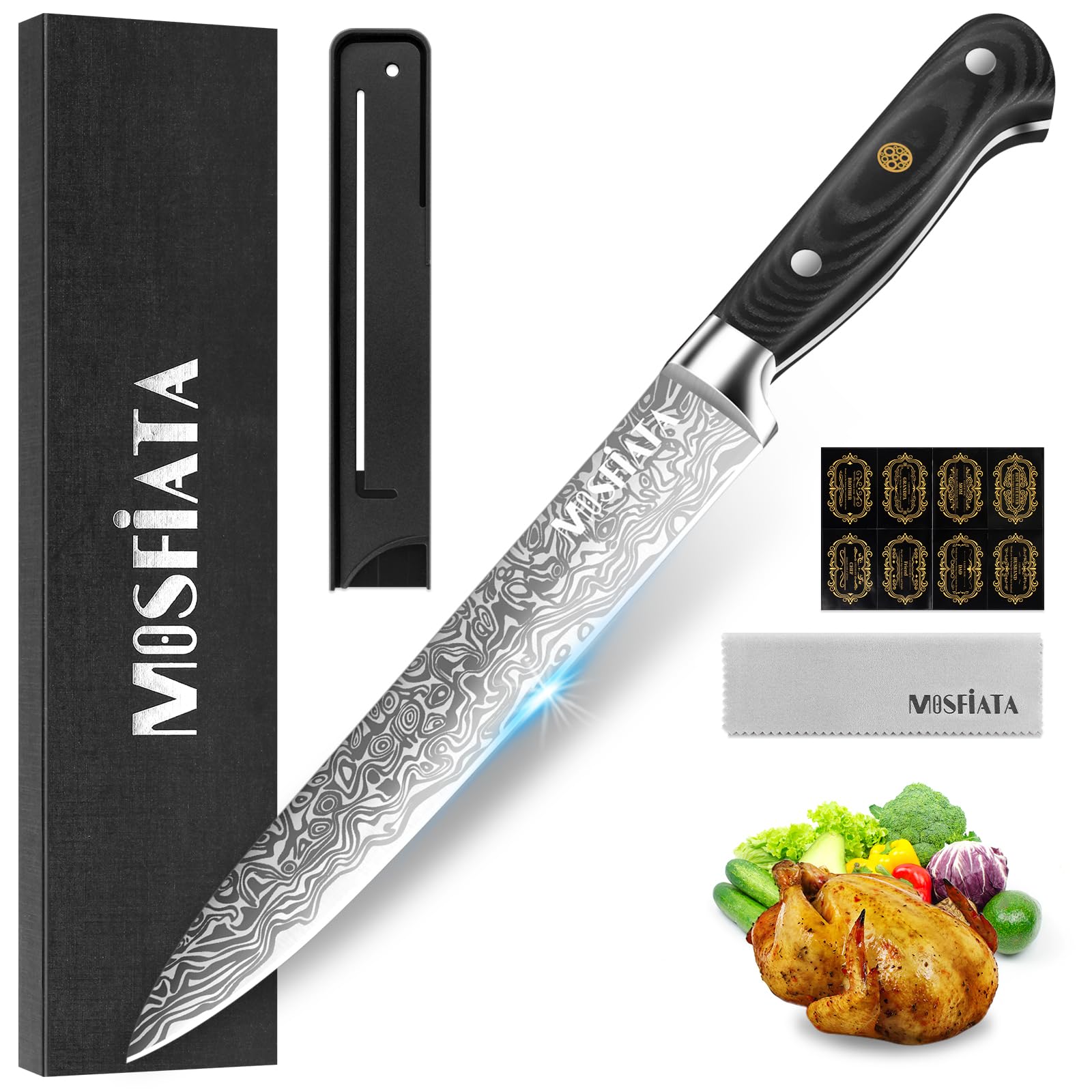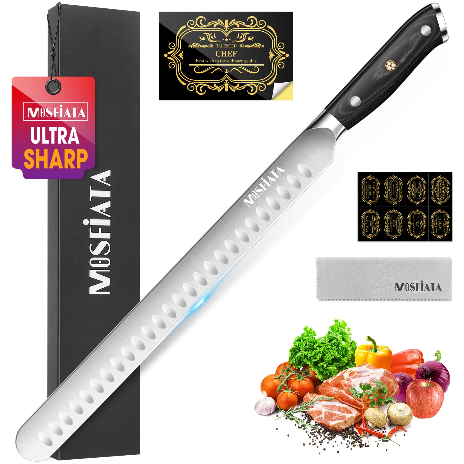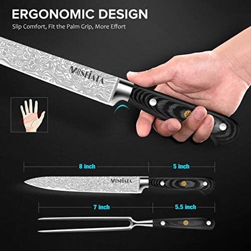 - 【Carving Knife and Fork Set】: Our MOSFiATA 8 inch Carving Knife and 7 inch Fork, which is made of high-quality German stainless steel that resists rust, corrosion and discoloration. It can be used for your daily kitchen tasks of chopping, slicing, dicing and mincing of all kinds of meat, vegetables, fruits and bread. It is suitable for both home and restaurant kitchens.