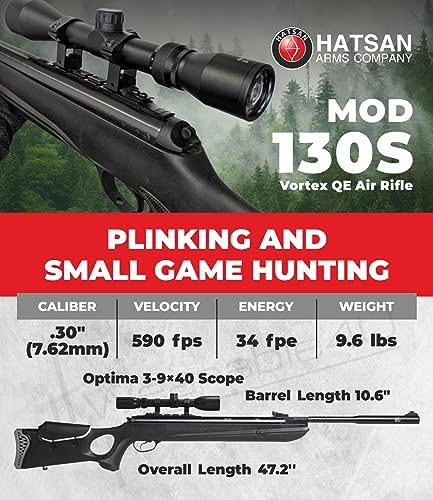 • IN THE BOX: 1 x Hatsan Mod 130S NEW .30 Cal Vortex QE Air Rifle, 1 x Rifle Scope 3-9×40 Scope, 1 x Pack of NEW Baracuda 100ct Pellets, 1 x Pack of 100x Paper Targets