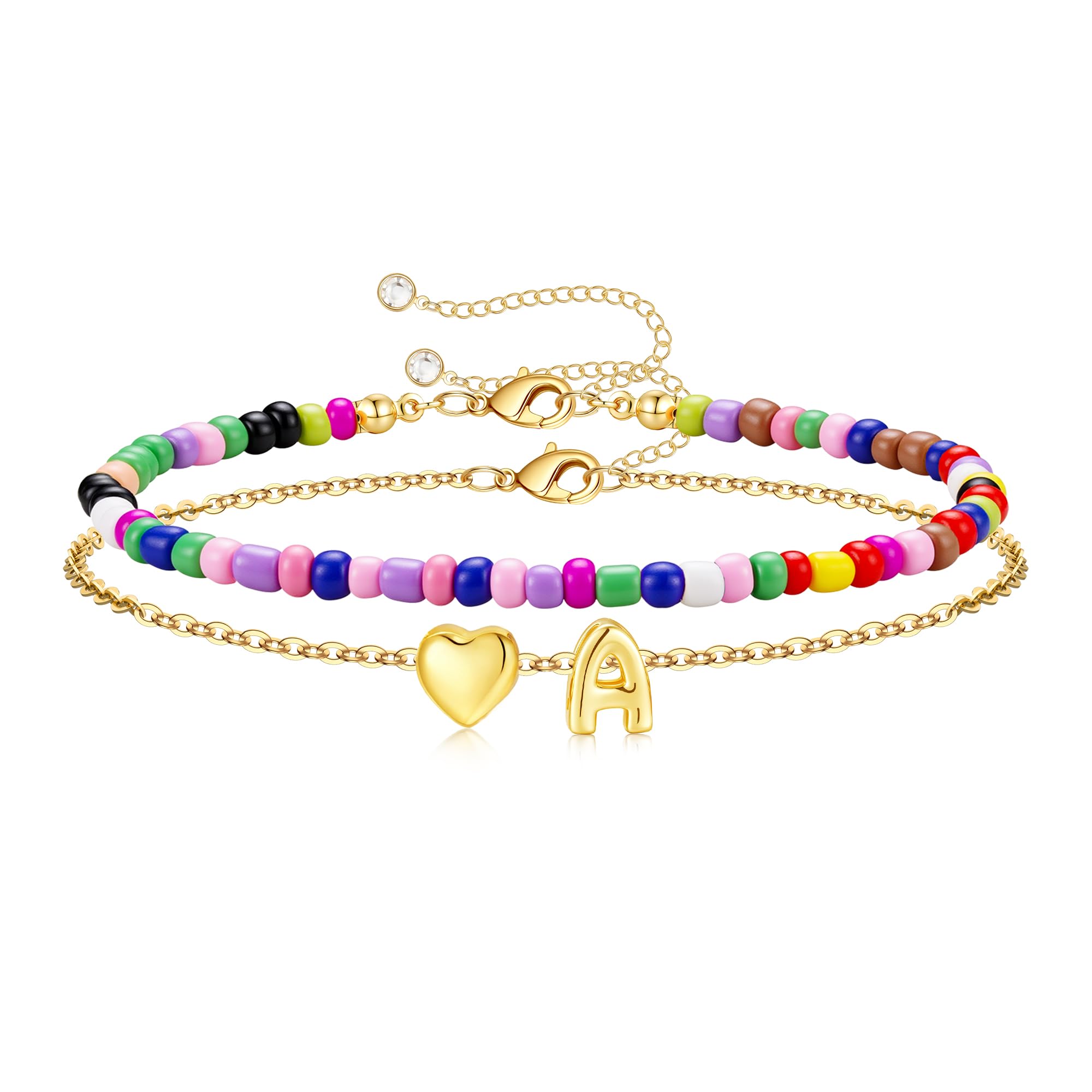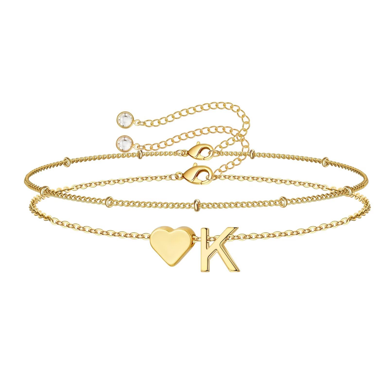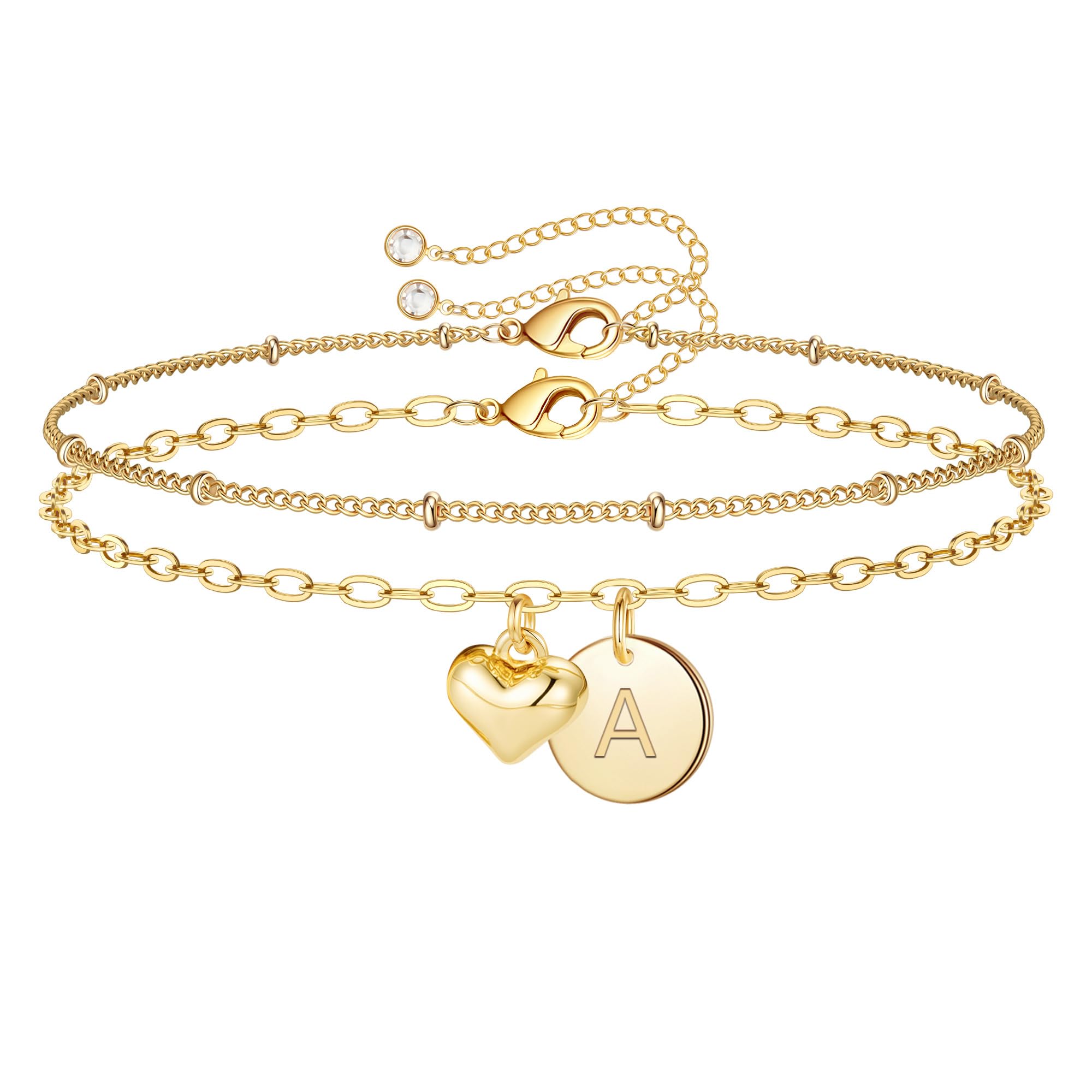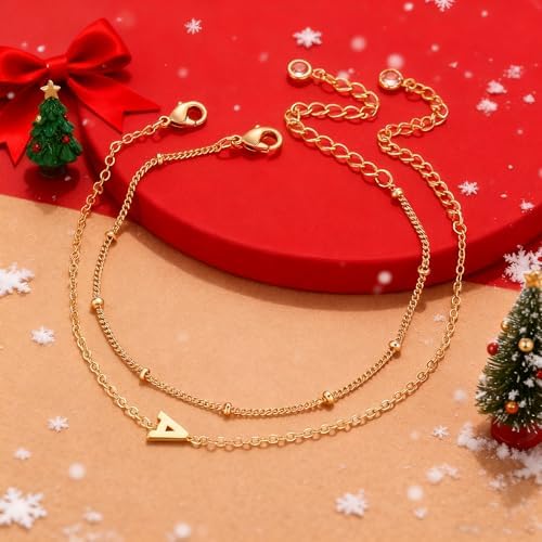 M MOOHAM Stocking Stuffers for Women Girls - Layered Initial Bracelet Letter A-Z Charm, Dainty 14K Gold Plated Initial Bracelets for Women Birthday Personalized Gifts Trendy Jewelry