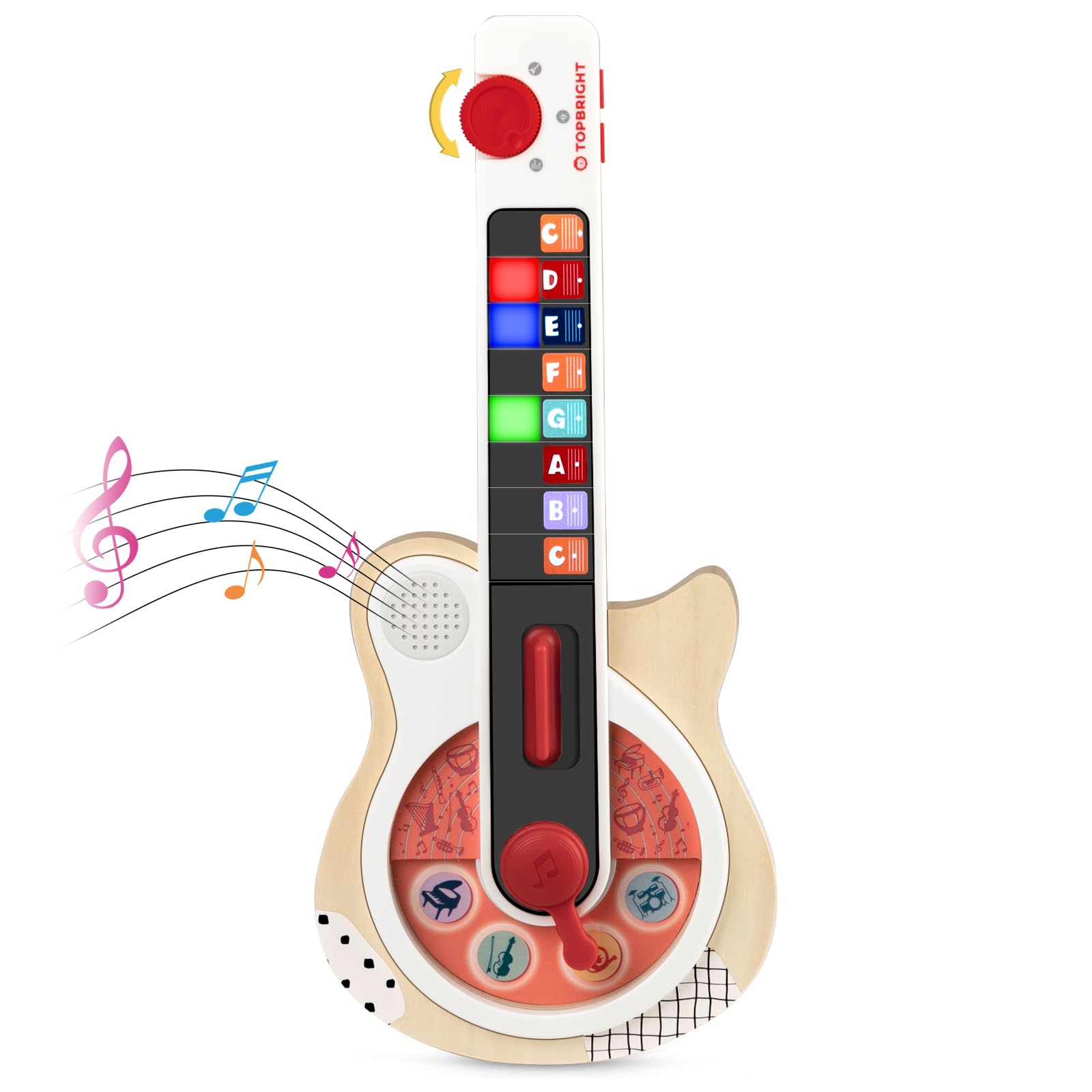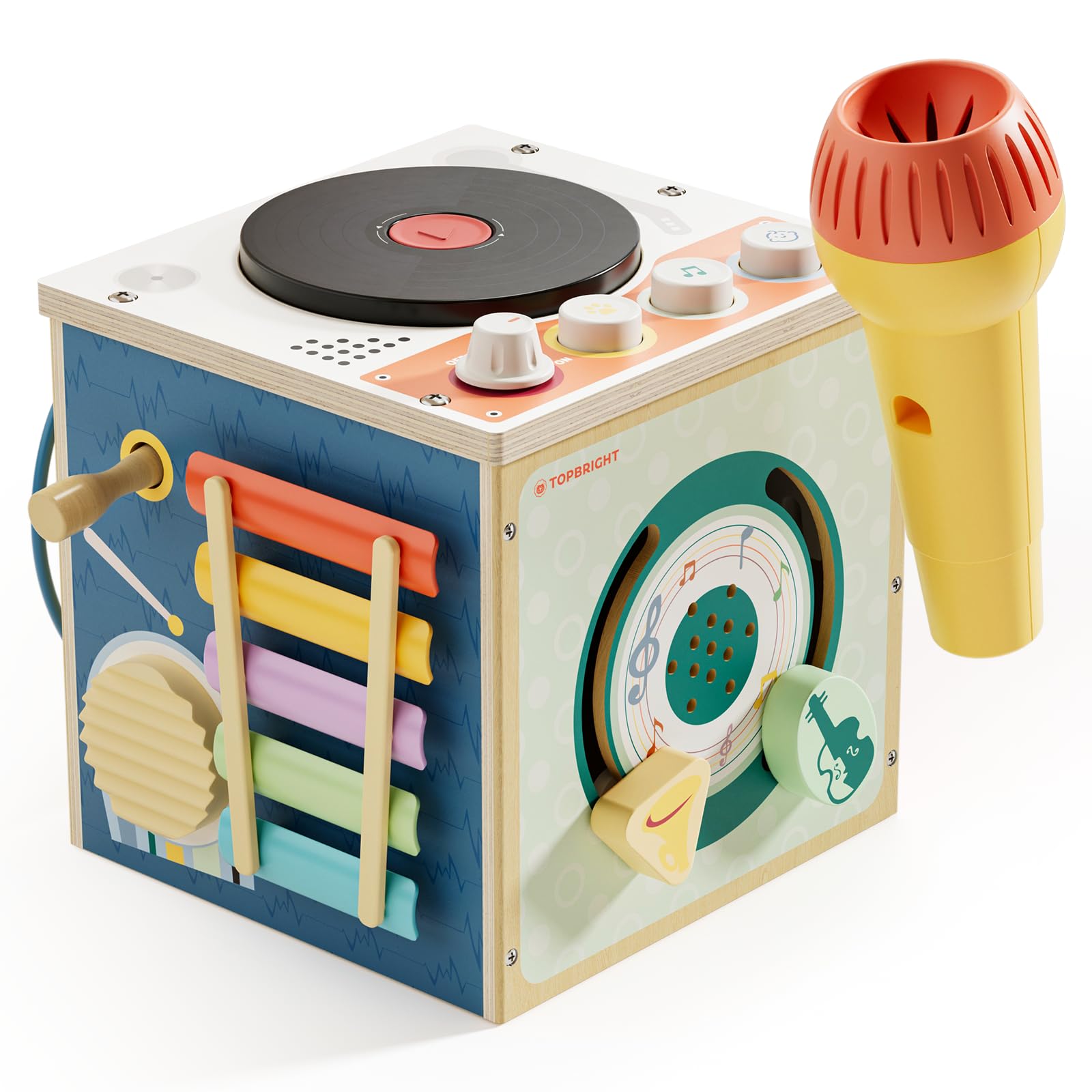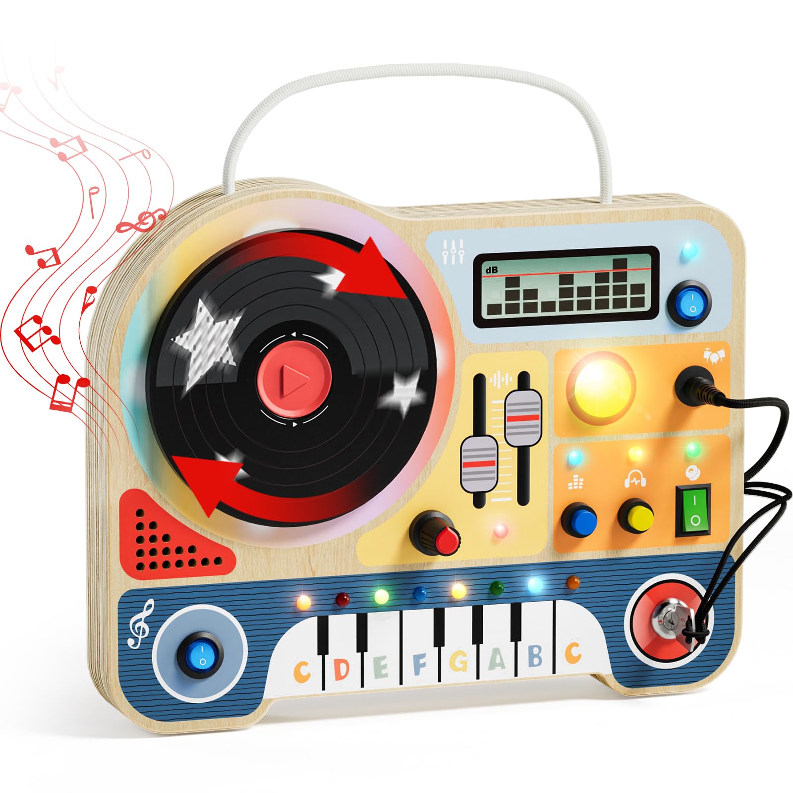 TOP BRIGHT DJ Music Busy Board - Wooden Toddler Toys for Boys and Girls,Montessori Sensory Toy with 14 Activities with Sound Blocks, Portable Travel Toy for 18M+