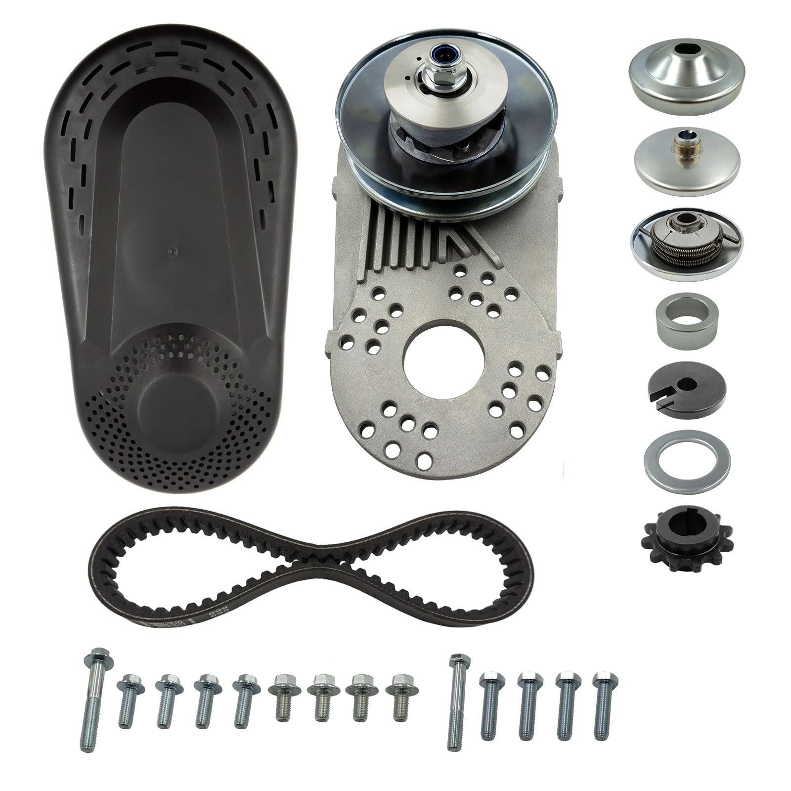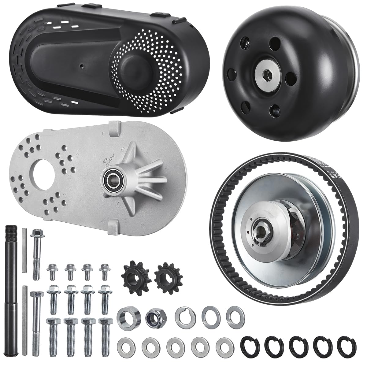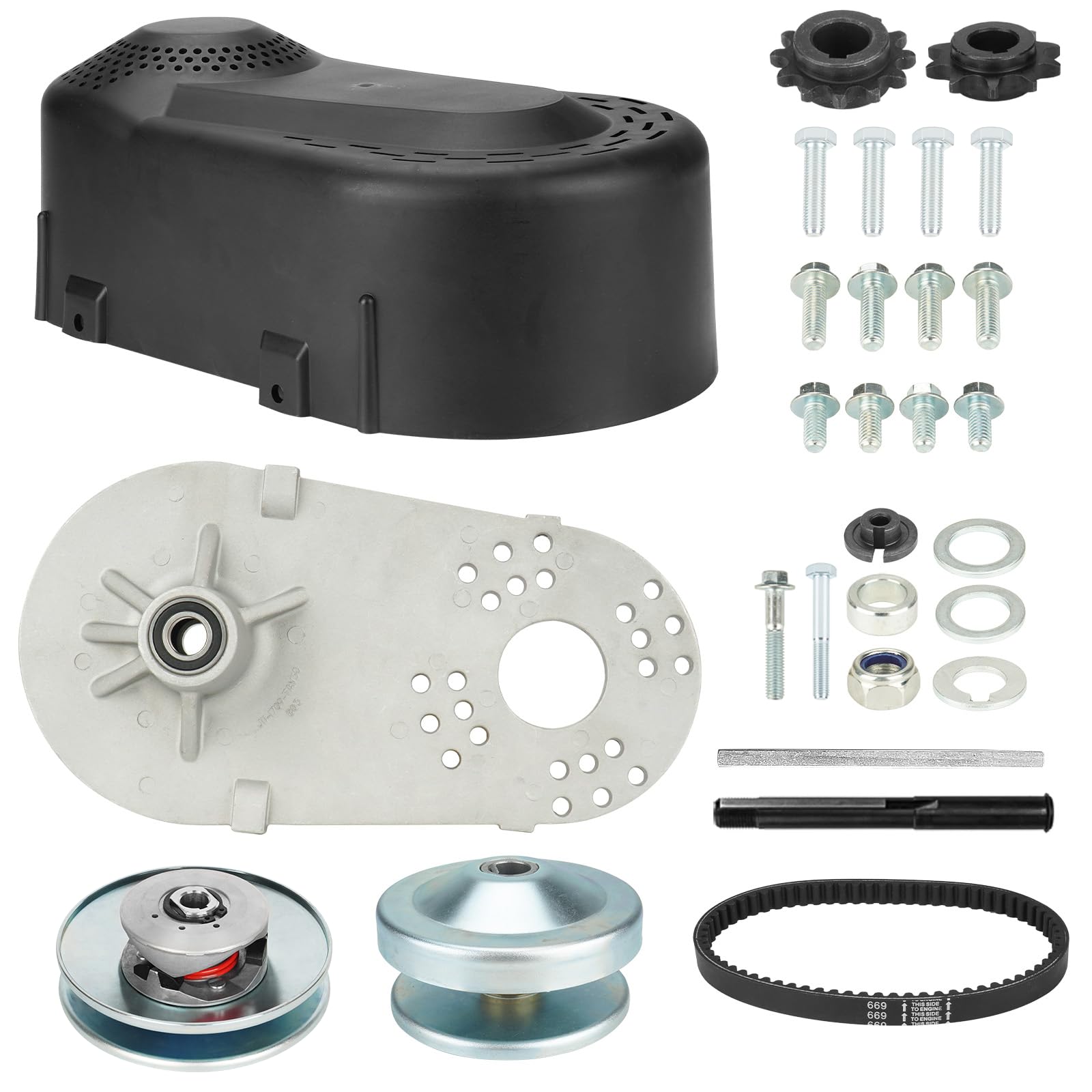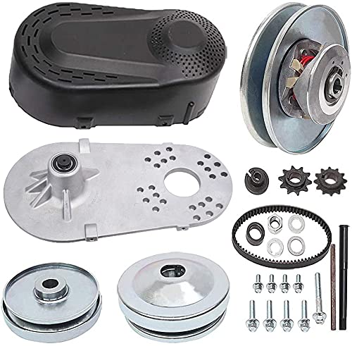 - Driver clutch bore: 1"(24.5mm),Driven unit: Overall Diameter 6" (5/8" driven pulley) ,This is a complete kit that includes both drive and driven clutch pulleys, belt, aluminum engine mount plate, built in jackshaft with sprocket, all mounting hardware, and instructions. Includes both 10t for 40/41 chain and 12t for 35 chain