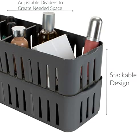 Simplify 4 Compartment Stackable Bin with Adjustable Dividers | Drawer Organizer | Storage Basket | Good for Office | Desk Supplies | Dorm |Bathroom | Accessories | Make Up | Grey