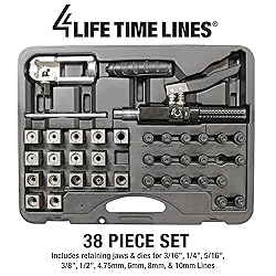 - 4LIFETIMELINES' Hydraulic Universal Flaring Set: When it comes to being fully prepared for any flaring task, 4LIFETIMELINES offers the ultimate cost-effective solution. Our Hydraulic Universal Flaring Set, known as the LFT3 set, is designed to cater to your brake line fabrication needs with unmatched precision and efficiency. Versatile Flaring Capabilities: With the LFT3 set at your disposal, you gain the ability to create perfect 45-degree flares of various types, including SAE Inverted, ISO Bubble, Push-Connect, GM Fuel Line, and Single flares—all accomplished in a matter of moments. Whether you're a professional mechanic or a DIY enthusiast, this set ensures you can tackle a wide range of flare styles with confidence and ease. Comprehensive Tubing Compatibility: We understand that brake lines and tubing come in various sizes and specifications. That's why the LFT3 set includes an extensive array of retaining jaws and dies, covering tubing sizes of 3/16, 1/4, 5/16, 3/8, 1/2-inch, as well as their metric equivalents, including 4.75mm, 6mm, 8mm, and 10mm. This comprehensive selection guarantees that you're always equipped with the perfect tools for the job, no matter the tubing size or material. Invest in the 4LIFETIMELINES' Hydraulic Universal Flaring Set, and you'll have the confidence of knowing that you're ready to handle any flaring task that comes your way. This versatile set is your gateway to achieving professional-quality flares quickly and effortlessly, making it an essential addition to your toolkit for automotive repairs, plumbing projects, and beyond. Don't compromise on the quality of your flares—choose the LFT3 set for precision, efficiency, and cost-effectiveness.