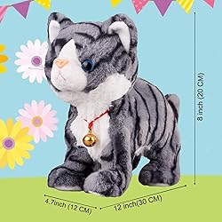 Can Do 8 Movements, Meow meow, Touch Control : It will do all kinds of tricks like tumbling, clapping hands, bowing, upside down, crawling, shaking body to seek fondling from my master as long as you gently touch its tail, and it also sound a bark or baa baa cries. Baby Friends Cat for Baby: The Touch-controlled plush CAT can be the loyalest playmate of your baby, during playing & fondling with it, your baby’s listening, attention and perception of things can be enhanced, which helps to the cultivation of love as well as the development of the intelligence of your baby to build a rich and colorful childhood. Directions for Use: 1.Open the battery box cover (on the stomach) with a screwdriver, 2. load 4 AA batteries, 3. and turn the switch to ON position; the CAT will make 8 movements, and make sounds of barking or bleating if you fondle the CAT's tail Or back. High Quality Fabric: The toy CAT is made of high quality short plush fabric, with a state of the art workmanship which provides you a soft and comfortable touch, no dropping hair, non-toxic, no smell, and with an extremely vivid and cute appearance, smart and funny actions, you are guaranteed for your baby’s fondling. Note:Can't walk,4 AA batteries not included, L:12" * H:8" * W:5"(30cm*20cm*12cm) the CAT uses 4 AA batteries which are not included in the package; it Can't walk, This toy can Barking, can't play music; suitable for children over 3 years old.