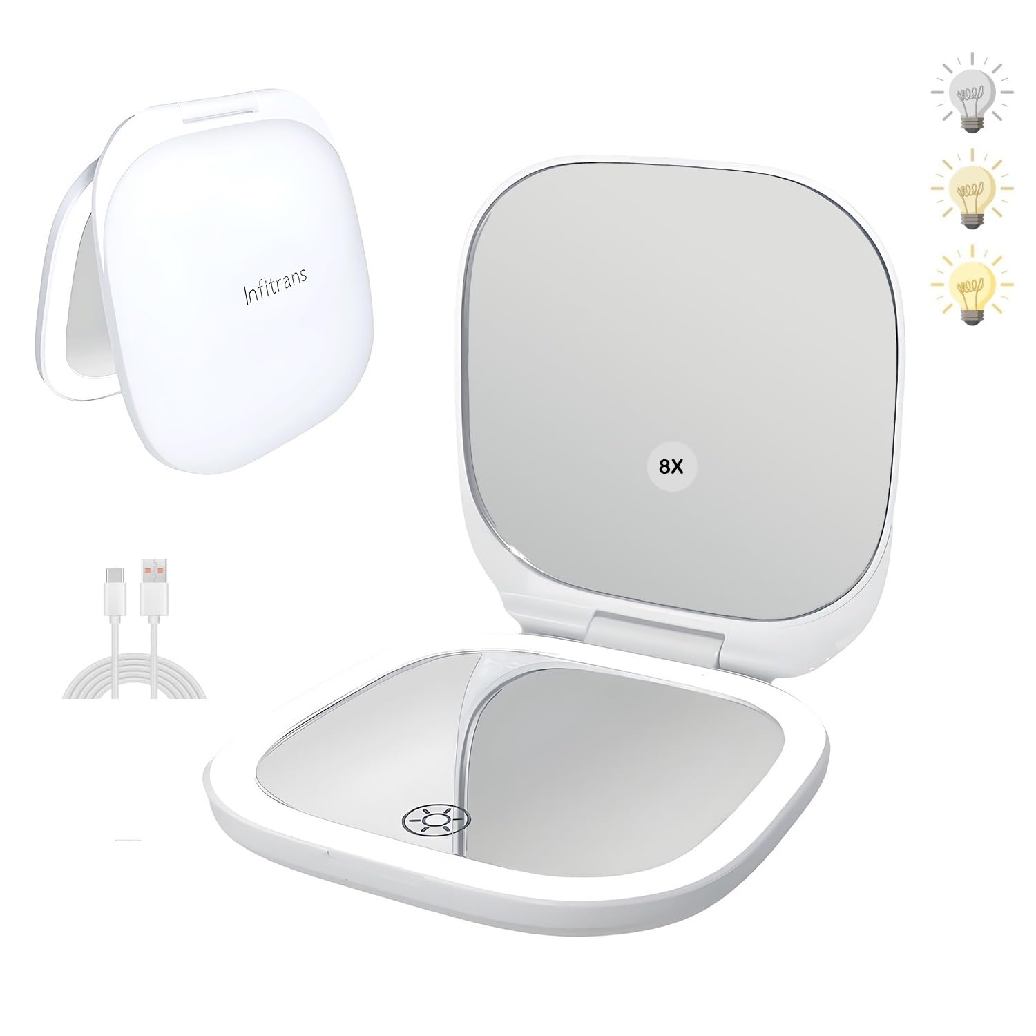 - 【 Rechargeable Illuminated Mirror 】- Built-in 2000mAh lithium battery, connect a laptop, charger or mobile power supply via Micro USB for charging, no worry about replacing batteries. Compact, lightweight, ultra thin and foldable, you can easily put it in your backpack and suitcase, fitting for home, travel or working use.