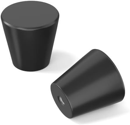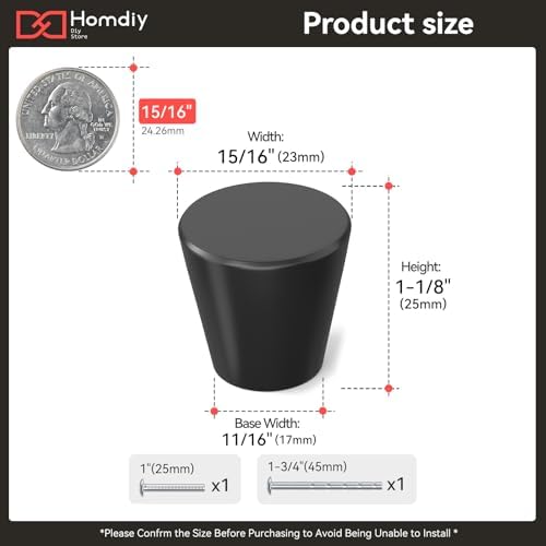 - Dimensions: Height: 1-1/8" (25mm); Diameter: 15/16" (23mm); Base Width: 11/16" (17mm). These black knobs for dresser offer a sleek, modern profile. Confirm your measurements before purchasing