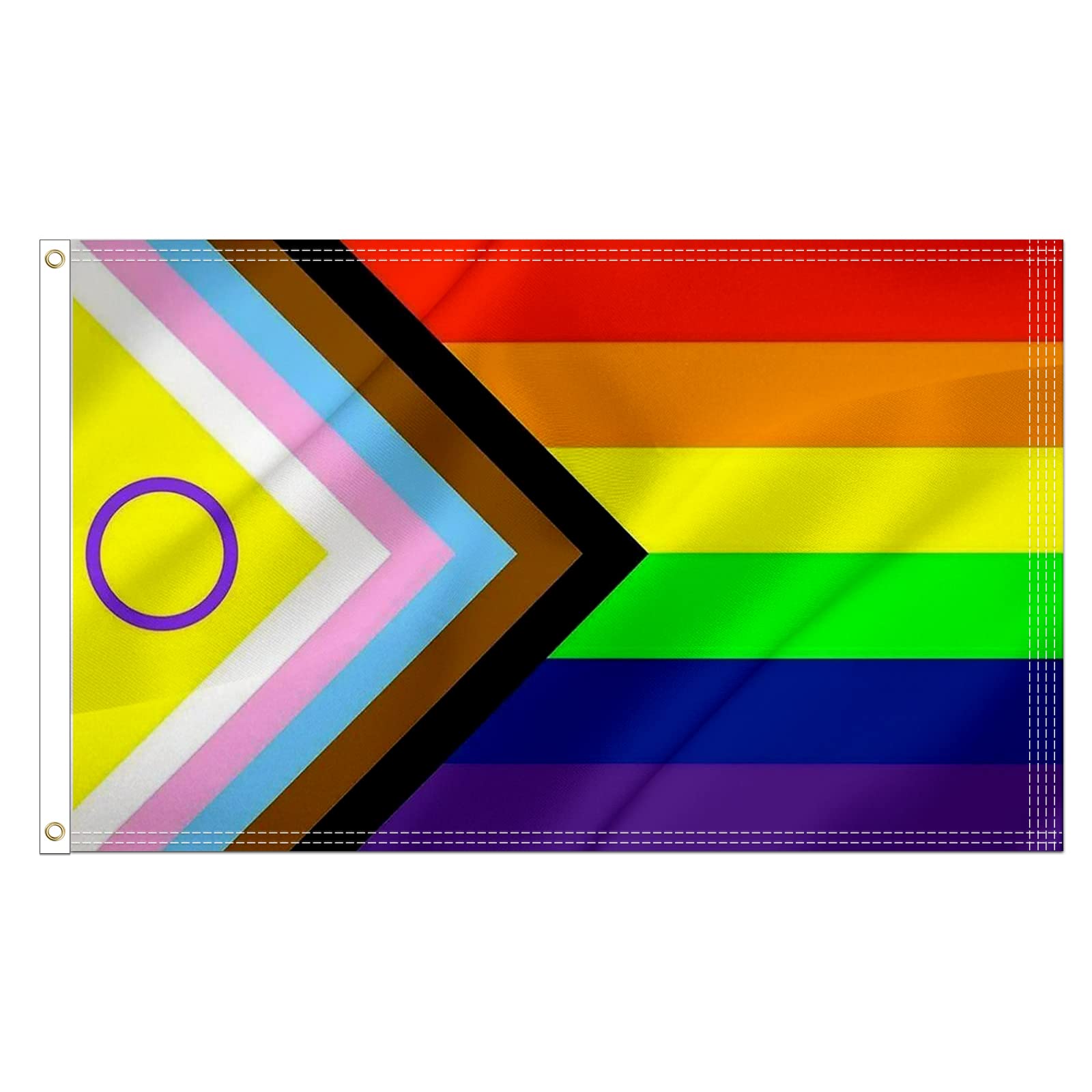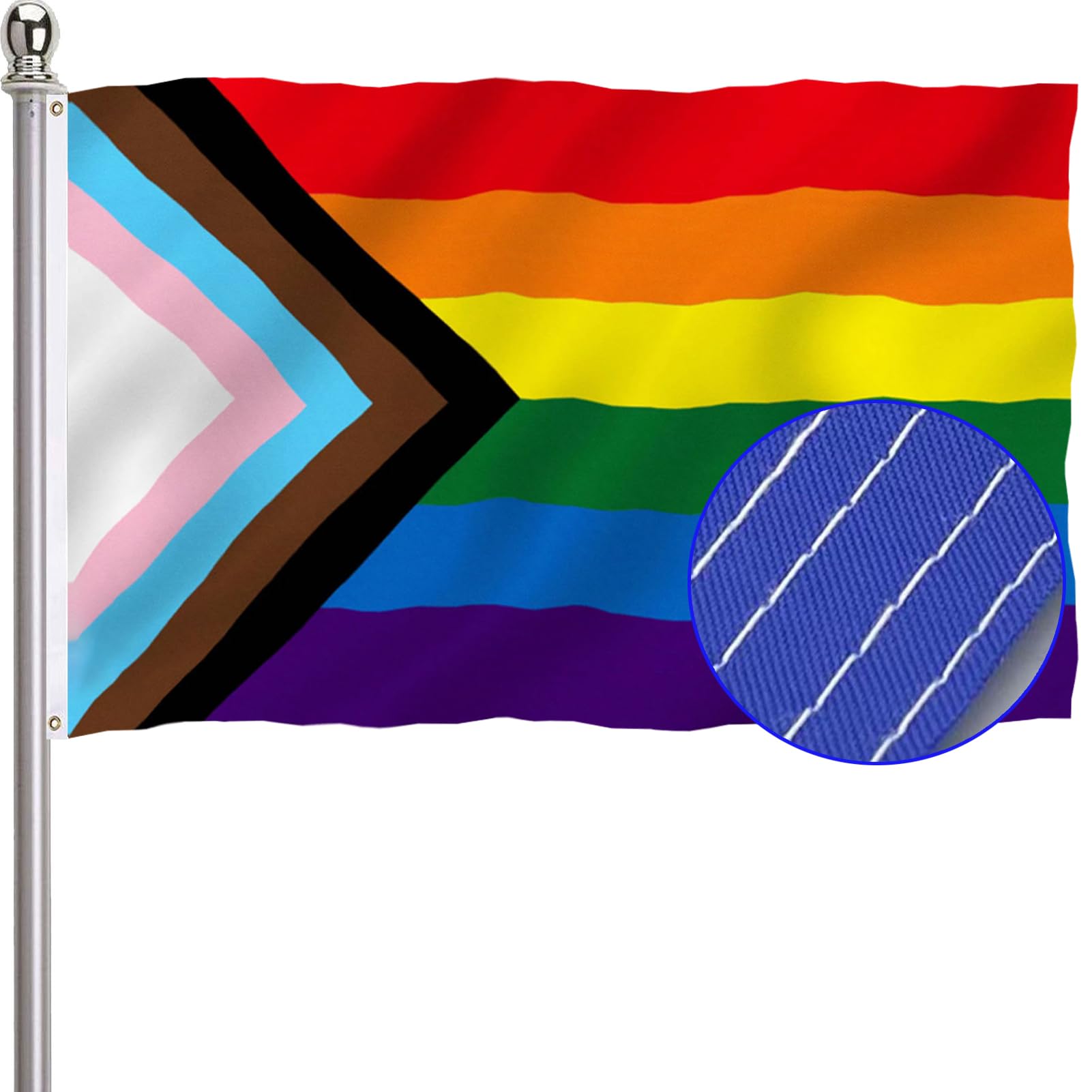 - PROGRESS PRIDE FLAGS NOT INCLUDE STAND- The progress Pride flag with its purple blue green yellow orange red stripes shaped into an arrow alongside pink and blue stripes from the transgender flag,hanging proudly