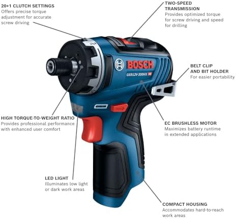 This 12V Max 1/4 In. 2-Speed Hex screwdriver is a professional-grade tool that provides real power at an unreal size. The Bosch GSR12V-300HX features an efficient brushless motor that delivers 300 In.-Lbs. of torque, along with a max speed of 1,750 rpm. With a head length of 5.0 In. and a weight of 1.3 Lbs. (tool only, not including battery), this compact powerful screwdriver is an ideal tool for overhead work or tight spaces. The quick-change 1/4 In. hex drive chuck provides enhanced bit grip and fast bit changes. It provides two-speed transmission and 20+1 clutch settings, for more precise screwdriving. It has an LED light to illuminate dark work areas. This is a bare tool kit; the battery and charger are sold separately.