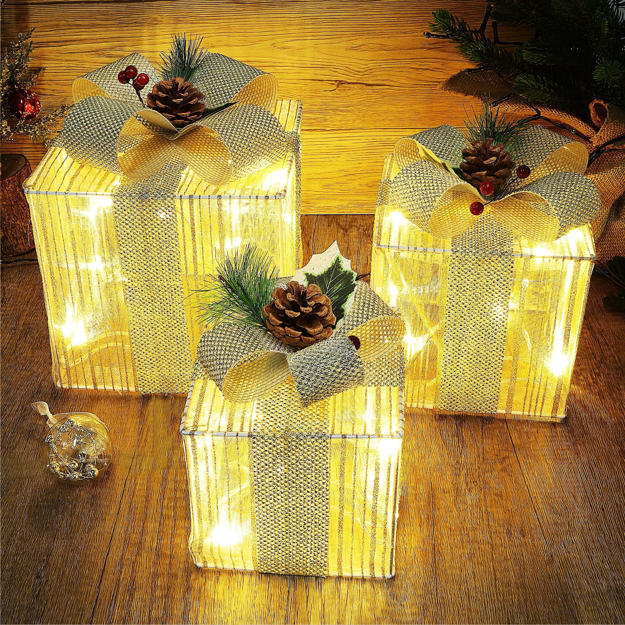 - SET OF 3 CHRISTMAS LIGHTED GIFT BOXES: Package comes with 3 lighted gift boxes in 3 different sizes – large: 7.5"x7.5"x7.1", medium: 6.1"x6.1"x5.9", small: 5.1"x5.1"x4.9". Plug the transformer into the wall outlet and the lights will come on.