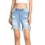 Highrise bermuda denim shorts with distressing across the front and a heavily ripped hem. Traditional 5 pockets with button and zip fly closure.Classic denim feel with decent stretch in denim.
