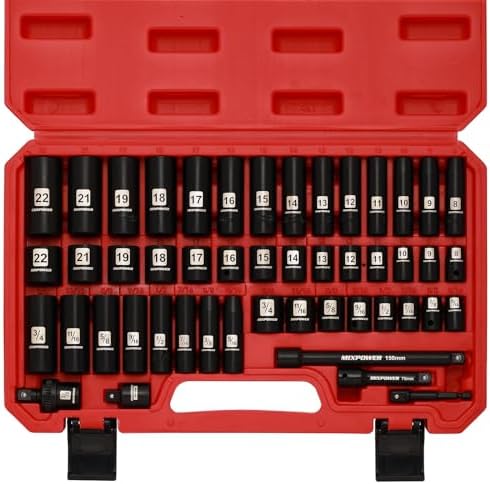 MIXPOWER 3/8" Drive Deep Impact Socket Set, 6 Point, 49 Piece Standard SAE and Metric Sizes-5/16-Inch to 3/4-Inch and 8-22 mm, 3/8'' impact universal joint, Cr-V Steel Mechanic Socket Set