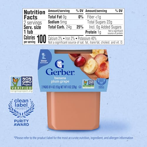 Gerber Stage 2 Baby Food, Banana Plum Grape Puree Tubs are a premium choice for your child’s early stages. Crafted to help support their nutritional needs, along with meeting the busy lifestyle needs of caretakers and parents. Each baby puree tub comes in a portable, easy-to-store format – making it perfect for life’s busy moments. This stage 2 baby food puree is designed for babies who are 6 months + and are ready to explore new textures and flavors. Gerber understands the importance of providing wholesome ingredients during the crucial developmental stages of your child's life -- that’s why our baby puree is Non-GMO Project Verified. Gerber baby puree is ideal for parents who seek a convenient and high-quality option in their baby's diet. These tubs need to be refrigerated after opening and must be used after 1 day.