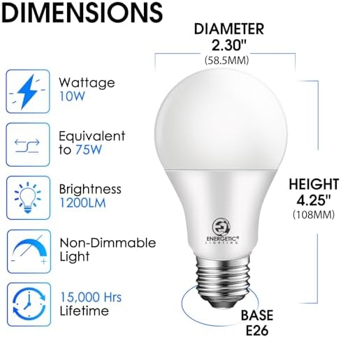 Energetic 75W Equivalent A19 LED Light Bulb, 4000K Cool White, Non-Dimmable LED Light Bulb, 1200lm, UL Listed, E26 Medium Base, 12-Pack