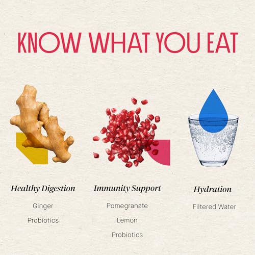 Enjoyed for thousands of years for its superfood benefits and naturally sweet nectar, pomegranate is combined with warming ginger, lemon and probiotics to support immune and digestive health. Our pomegranates are sourced locally from organic family farms in the San Joaquin Valley, picked and juiced at the peak of freshness