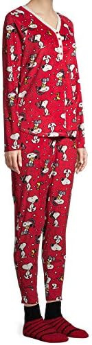 Enjoy this incredible Peanuts Snoopy Red 4 piece gift set! Includes minky fleece PJ top and bottoms, along with matching minky Snoopy on his house socks and super silky deep red Santa hat. Gift packaged with a ribbon around it!