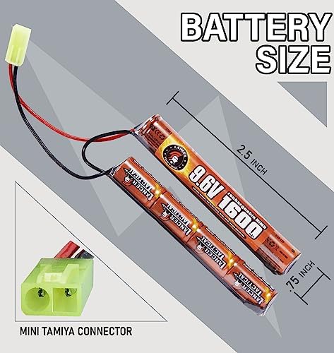 Specifications: Battery Type: Nickel Metal Hydride Battery (NiMH Battery) Voltage: 9.6VExtend your NiMH battery pack life with the following practices: Fully recharge your new battery pack when you first receive it. Do not over-discharge the battery, stop using it when you notice a drop in performance. Do not over-charge the battery, remove the battery from the charger when you are done recharging.Heat lowers battery life, do not charge or discharge the battery when it's hot. Always let the batteries cool down to room temp before using it/charging it. Do not store the battery with low voltage, recharge after each use to avoid over-discharge.Always store the battery in a dry and cool place, never expose it to heat or direct sunlight.Recharge the battery once every 6-month, if they will be unused or stored long term. Warning: Please use caution when handling and using this airsoft NiMH battery. Do not puncture, disassemble, or expose the battery to fire or water. Doing so could cause the battery to leak, overheat, or explode, resulting in injury or damage. Always charge the battery using a compatible charger, and never overcharge or leave the battery unattended during charging. Overcharging the battery can cause it to overheat, which could result in damage or injury. Similarly, leaving the battery unattended during charging can increase the risk of overheating or other issues. Always use the battery with compatible airsoft guns and follow the manufacturer's instructions for use. Do not use the battery with other devices or equipment not designed for use with it. If you notice any signs of damage or wear on the battery, such as cracks or swelling, do not use it and replace it with a new one.