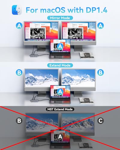 - 【Ultra 4K HDMI】 Outputting in 4K video quality, this usb c to dual hdmi hub maximizes the working efficiency for all visual creators. This usb c hub dual HDMI presents an Ultra-High-Definition video through 1HDMI for 4K 3840*2160@60Hz, 2HDMI for 4K 3840*2160@30Hz. Note: Limited by Apple Mac OS system itself, Mac OS system can only support SST mode, the display of 3 screens will be Laptop(A)+Monitor1(B)+Monitor2(B)
