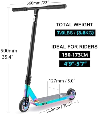 - Complete pro trick scooter is lightweight 3.5kgs(7.9lbs). The deck was built of aircraft-grade aluminum with T6 heat treatment to guarantee the strength and safety, The deck was upgraded to the 127x520mm to make more space for standing. 115x26mm wheels are equipped with high-precision ABEC-9 bearings and 88A high-return PU. PU with holes design doesn’t only make the wheel look modeling, but also increase its grip and reduce its weight