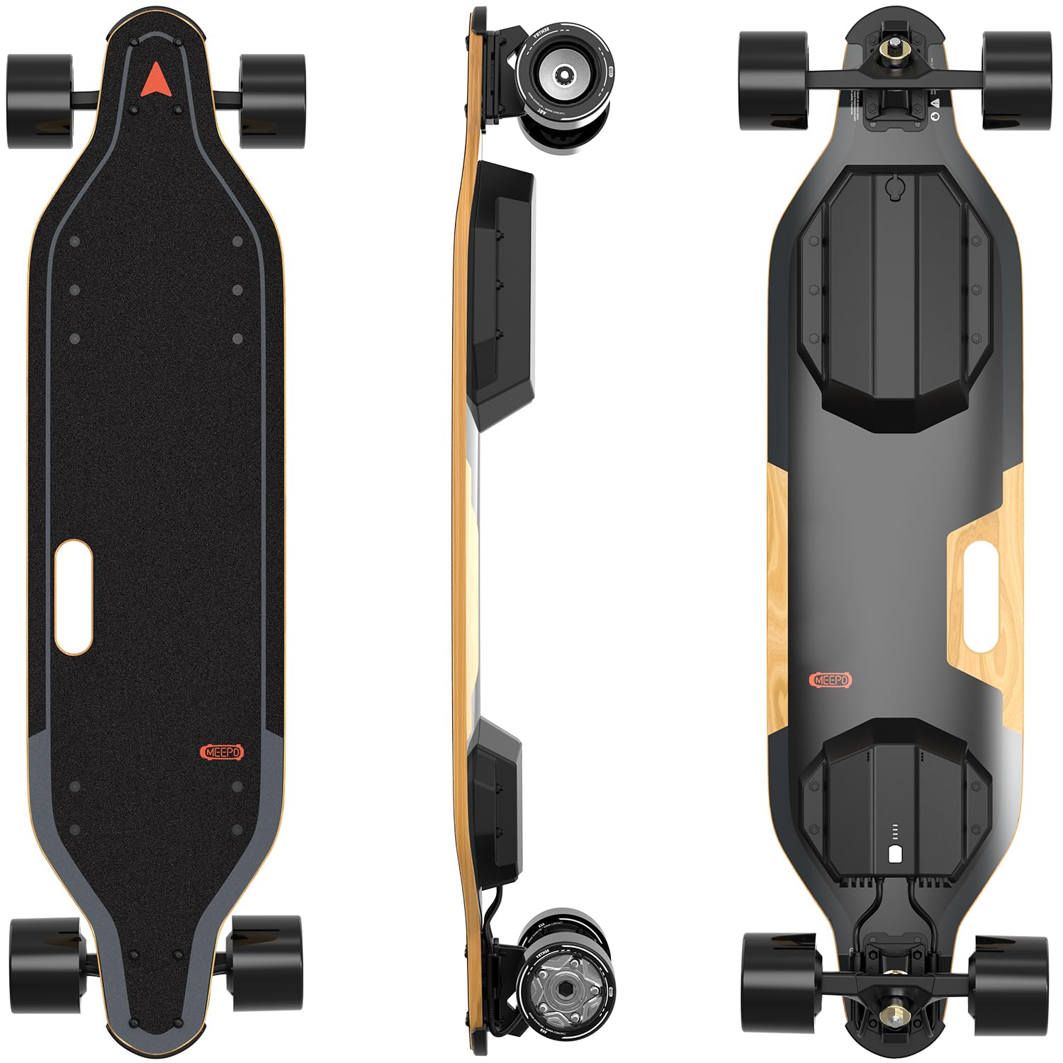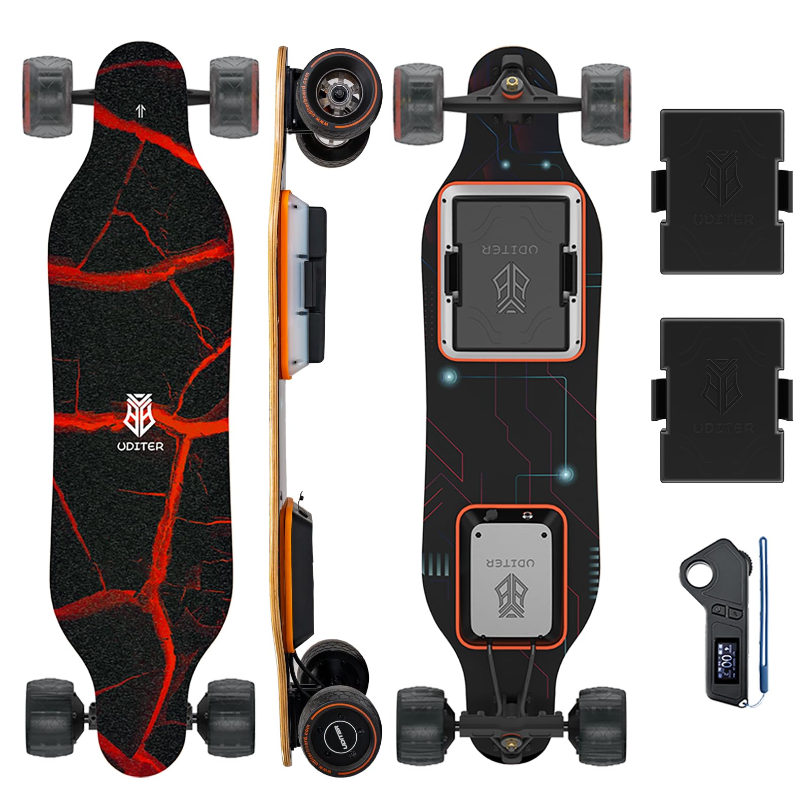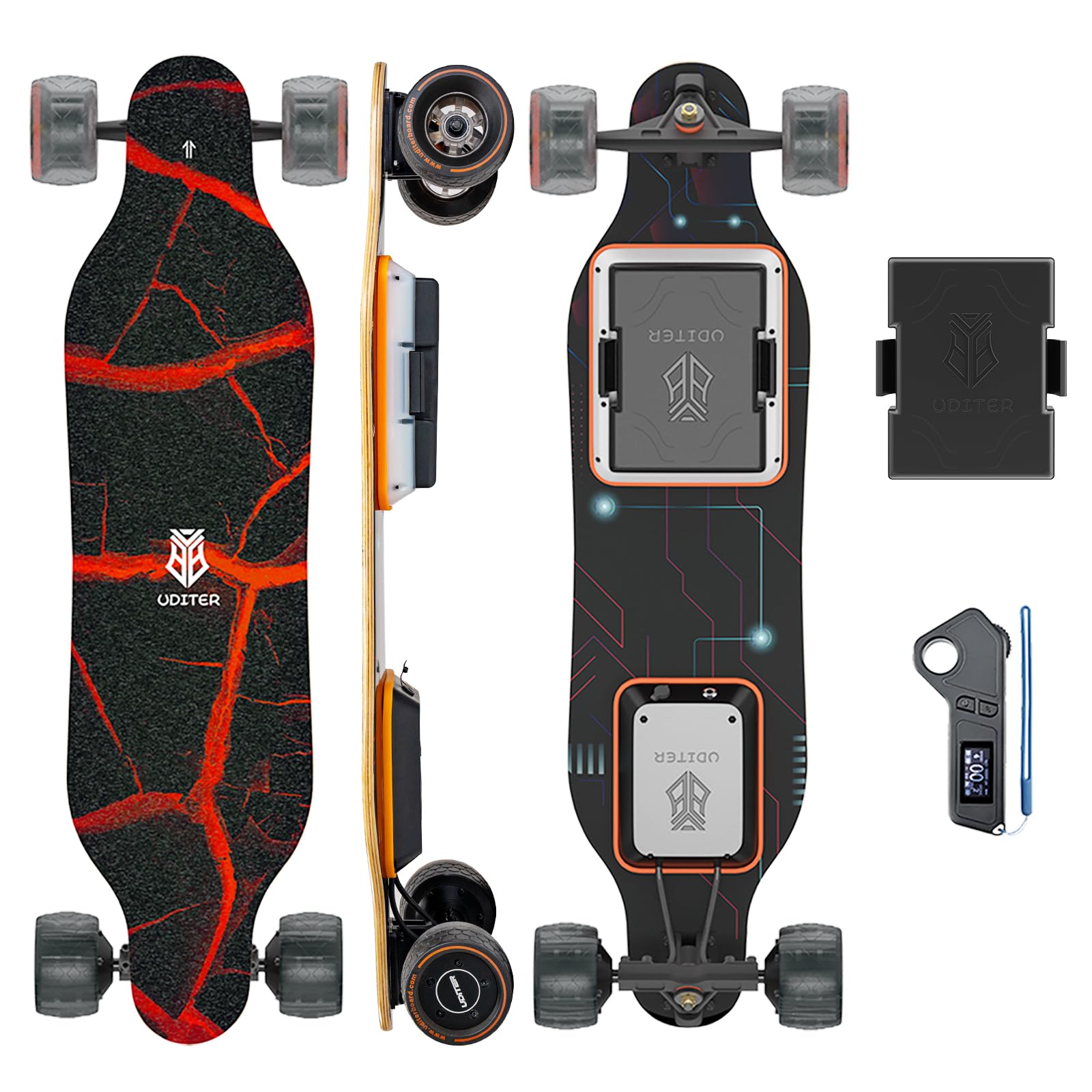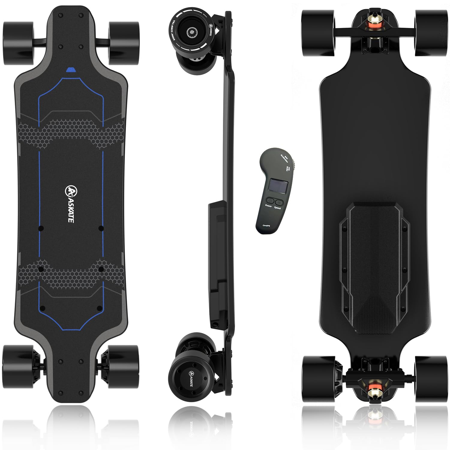 • 350W BRUSHLESS HUB-MOTOR - Compared with the belt drive motor, the brushless hub-motor is more reliable and less problems. Even without motor,your electric skateboard can also be used like a regular board, making it easier to use no matter where,JKing Wireless Remote E-Skateboard This motor supports max 5° climbing angle.
