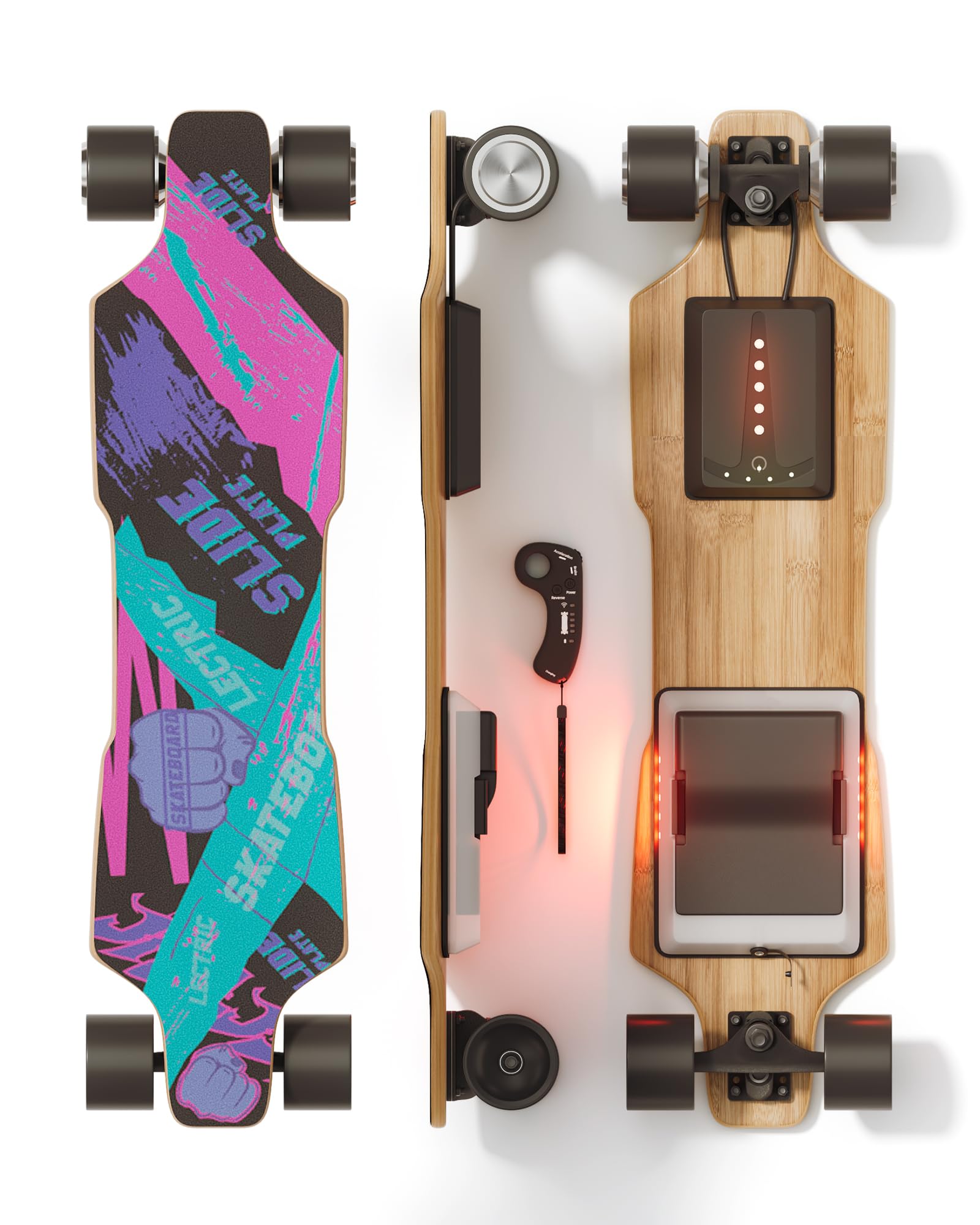 • MULTIFUNCTIONAL REMOTE - Portable electric skateboard with remote, take you to enjoy the scenery anytime, anywhere. Switch freely, accelerate, brake, forward and backward, 3 speed modes .designing for happy time and cool cruising.