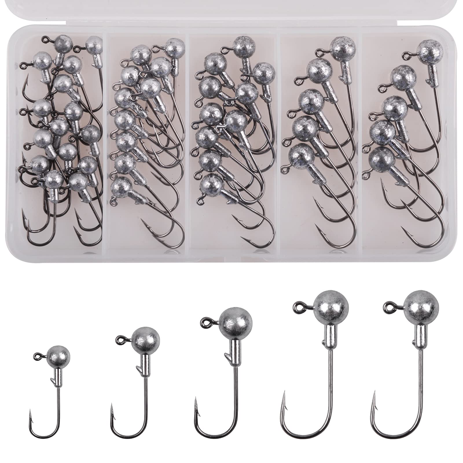 - Package Include: You will get 75pcs fishing jig heads kit. Including: 1/32oz-25pcs, 1/14oz-20pcs, 1/8oz-15pcs, 3/16oz-8pcs, 1/4oz-7pcs. They are enough for you to use and replace.(Random colors)