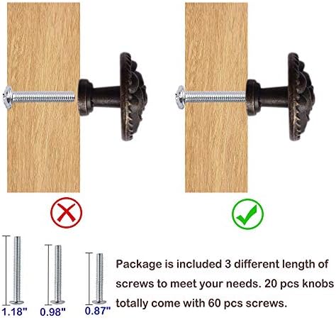 - Packing Included: 20 packs round vintage cabinet knobs. Each retro rose cabinet knob comes with 3 different sizes of screws. 20 packs bronzed drawer knobs includes 60 screws for DIY dressers knobs installation. (Screws length: 0.87 inch, 0.98 inch, 1.18 inch; thread of screws: M4)