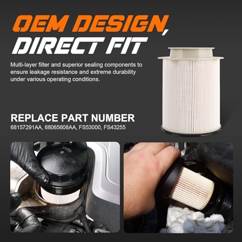- NÚMERO DE PIEZA DE REPUESTO: 68157291AA, 68065608AA, 680616344AA, MO608, Premium Guard DF99085, Wix WF10112, Hastings FF1279, Baldwin BF46031, MO867, L6806F, 33255, DF401-AD | NÚMERO DE PIEZA DE INTERCAMBIO: WF10255NP, Hastings FF1199, Baldwin PF9870, Fleetguard FS53000, PTC GF401EX, Fram FS43255, CS11037, 4947561. Excelente repuesto para un ajuste adecuado y una fácil instalación, se utilizan materiales de calidad, cumplen o superan los estándares OEM, probados al 100% rigurosamente antes del envío.