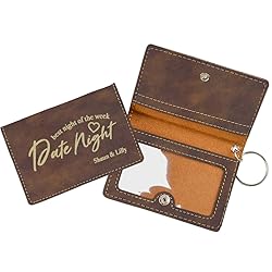 - Create a unique gift for the happy couple by customizing the faux leather wallet and filling it with date night ideas and gift cards for future use. These make great wedding gifts, anniversary, engagement, new baby, new couple, Valentine and sweetest day gifts. This customizable faux leather keychain wallet has one outside pocket and two inside pockets in addition to the clear ID window. This wallet snaps closed to keep your belongings secure. Offered in a variety of colors, we are sure to met everyone's style needs. <><>Cleaning Instructions: To clean laserable leatherette items, use water and soap. it will not leave water spots. Alcohol works well on pen marks. Leatherette does not absorb finger oil and is stain and water resistant.