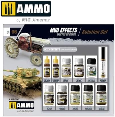 With this set, you will be able to replicate different types of effects including dry mud, wet mud, and mud splashes. These sets are the perfect solution for casual modellers and those experienced enthusiasts looking for the most realistic painting options in one convenient box.Each reference in the series contains the essential products you require to create the most common effects used in scale modelling. Among the versatile items included are Oilbrushers, Pigments, Washes, Filters, and the products necessary to obtain hyper realistic results on your models. You will have all the necessary products in a single set, without having to worry about what product you should use to simulate each specific effect. We have provided you with the most accurate and easily applied products for each subject. These sets are the perfect solution for casual modellers and those experienced enthusiasts looking for the most realistic painting options in one convenient box.Products included:A.MIG-0079 Clay BrownA.MIG-2015 Wet EffectsA.MIG-0085 NATO Brown A.MIG-3023 Sinai DustA.MIG-1701 Thick Soil A.MIG-3026 Golan EarthA.MIG-1705 Wet Mud A.MIG-3029 Winter SoilA.MIG-1750 Dry Earth A.MIG-3522 Medium SoilA.MIG-1754 Damp Earth