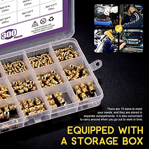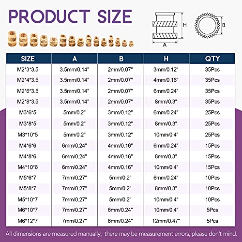 ★ Swpeet 300Pcs 5 Values M2 M3 M4 M5 M6 Female Thread Knurled Nuts Brass Threaded Insert Embedment Nuts ★ ♥ ♥ WHY CHOOSE US? ♥ ♥ ✔ 1. Made of durable brass, it has excellent rust resistance and oxidation resistance, which can ensure long-term use. ✔ 2. It conforms to the standardized metric system. The average error is less than 0.01 mm. The threads are very sharp, clean, accurate and burr-free. Accurate size makes your installation or maintenance easier. ✔ 3. Widely used in laptop plastic case, desktop computer plastic case, GPS plastic case, router plastic case, mobile phone plastic case, unlimited communication facilities plastic case, household appliances plastic case, automobile, electrical appliances, medical, electronic and other plastic case. ▲ Product Specification: ● Color: Brass ● Type: M2 M3 M4 M5 ● Inner diameter: 4mm, 6mm, 8mm and 10mm ● Outer diameter: 3.5mm, 5mm, 6mm and 7mm ● Packing Quantity: 370 PCS ● Material: High-quality durable brass ● Product Name: Brass threaded insert nut assortment kit ▲ Package includes ● M2*3*3.5 ------------ 35Pcs ● M2*4*3.5 ------------ 35Pcs ● M2*6*3.5 ------------ 35Pcs ● M2*8*3.5 ------------ 35Pcs ● M3*6*5 ------------ 25Pcs ● M3*8*5 ------------ 25Pcs ● M3*10*5 ------------ 25Pcs ● M4*6*6 ------------ 15Pcs ● M4*8*6 ------------ 15Pcs ● M4*10*6 ------------ 15Pcs ● M5*6*7 ------------ 10Pcs ● M5*8*7 ------------ 10Pcs ● M5*10*7 ------------ 10Pcs ● M6*10*7 ------------ 5Pcs ●M6*12*7 ------------ 5Pcs ▲ Notes: ✿ Small parts. Not for children under 3 years old.