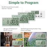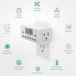 User Friendly Design: COKWEL digital timer features two 3-prong with grounded sockets is easy to operate and dual outlet allows you to control 2 different devices simultaneously. It’s quiet and slim. The large screen displays the week, hour, minute, and second. Accurate to the second, you can set the time control in seconds, One key return and clear for simply use. Customize Your Own Programs: Plug and play, simply plug in the COKWEL outlet timer and let it control your device following your desire programmable schedule at home or office. Set up to 10 independent ON/OFF programs in any 7-day pattern you can imagine; ON/OFF intervals are customizable down to 1 second. Application: The programmable timer is great for holiday/ Christmas decorations, patio lights, heaters, lamps, fans, charging, small appliances and other electrical devices with a handy timer. Protect Your Home and Save Money: This outlet timer helps to streamline your daily routines, reduce energy use, prolong their service lives and save on your energy bills by automatically power your appliances on and off as needed. Activate the “Random” vacation mode to randomize your programmed lights. Make your home look “lived in” even when you’re away. Safe & Reliable: This timer is rigorously controlled for quality and safety. Rating: 100V-120V, 60 Hz, 15A/1800W. The polarized 3-prong outlet reduces your chance of getting electrical shock. Child lock function to protect saved programs. We provide lifetime customer service and limited warranty.