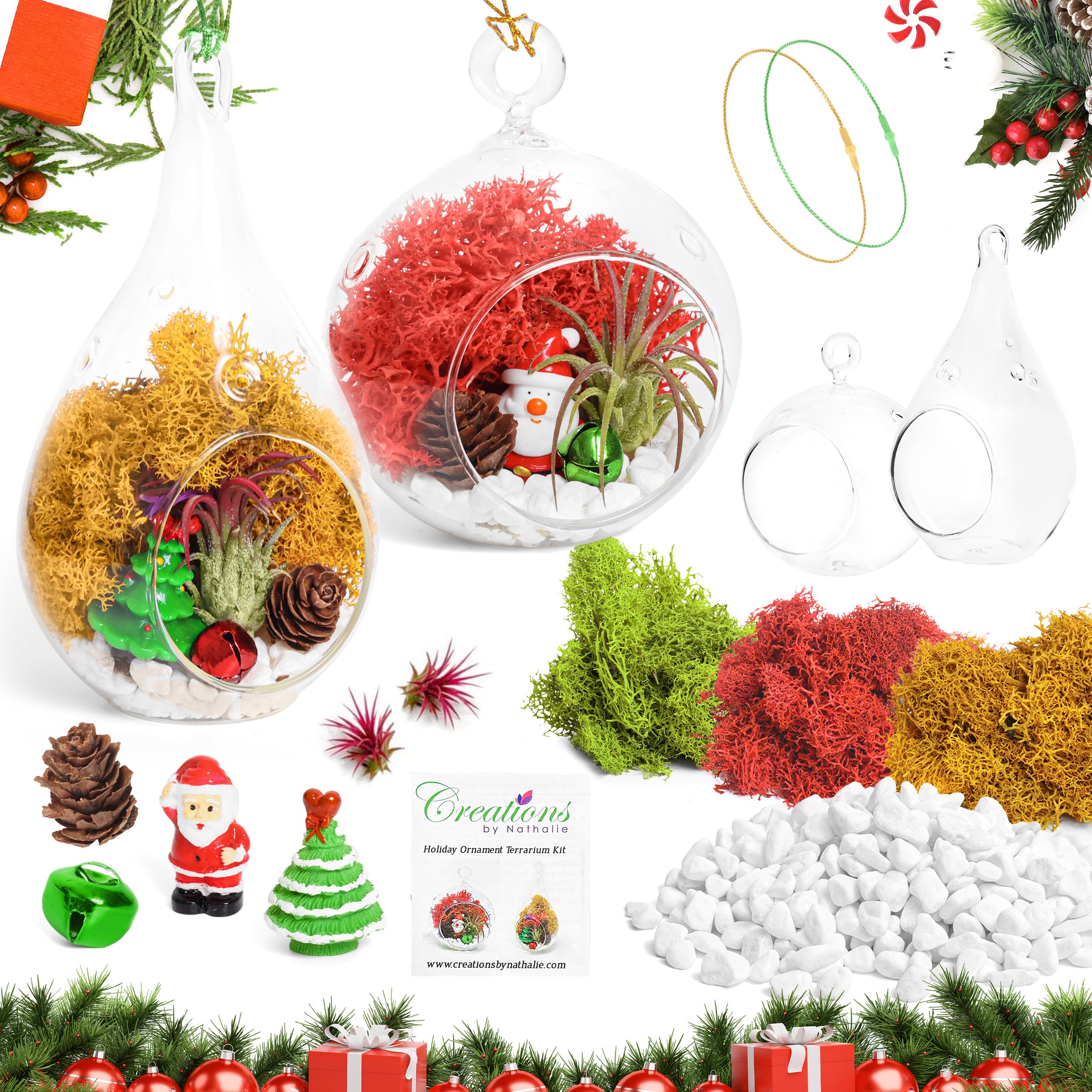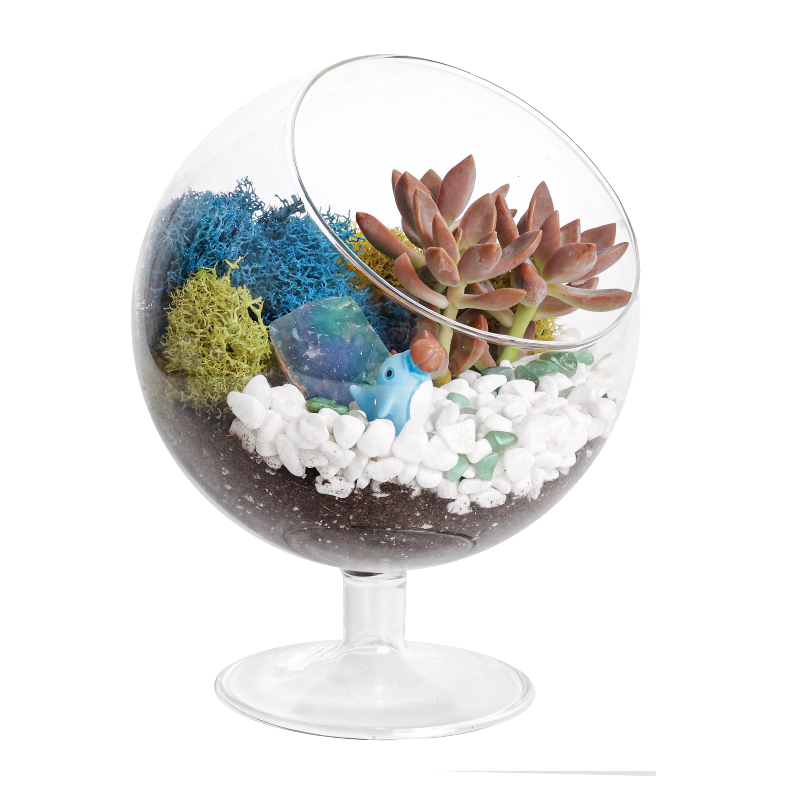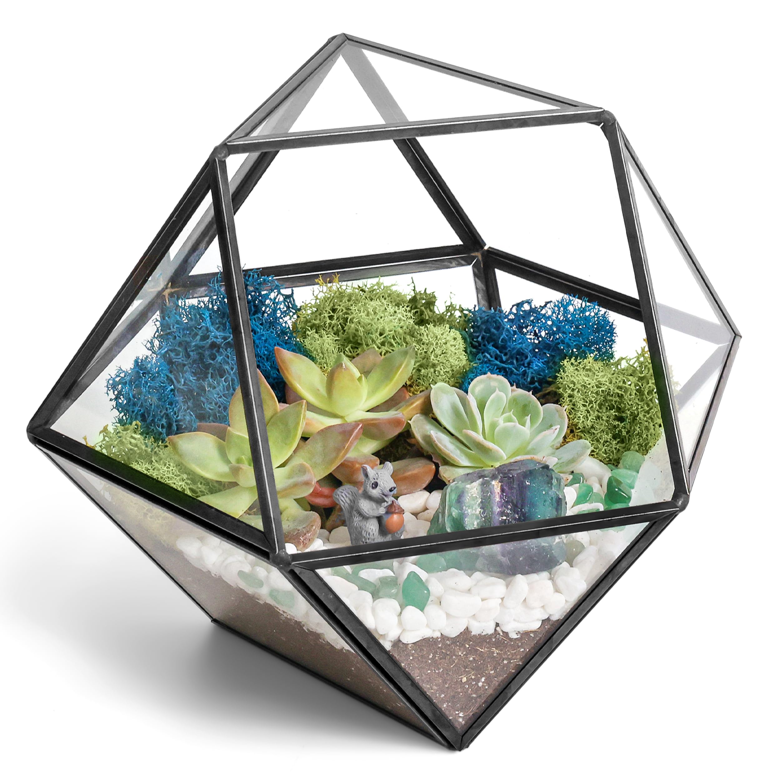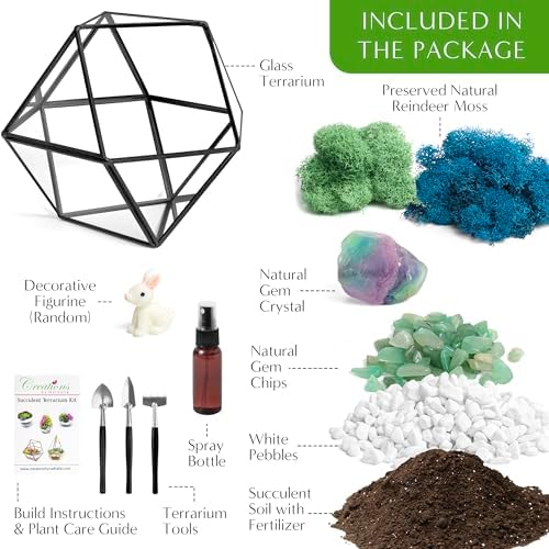 - ALL-IN-ONE DIY TERRARIUM KIT: Celebrate the season with this complete geometric terrarium kit. Includes a 7" glass container, moss, soil, pebbles, tools, crystals, and a figurine. Just add your own live air or succulent plant to create a beautiful self-sustaining ecosystem.