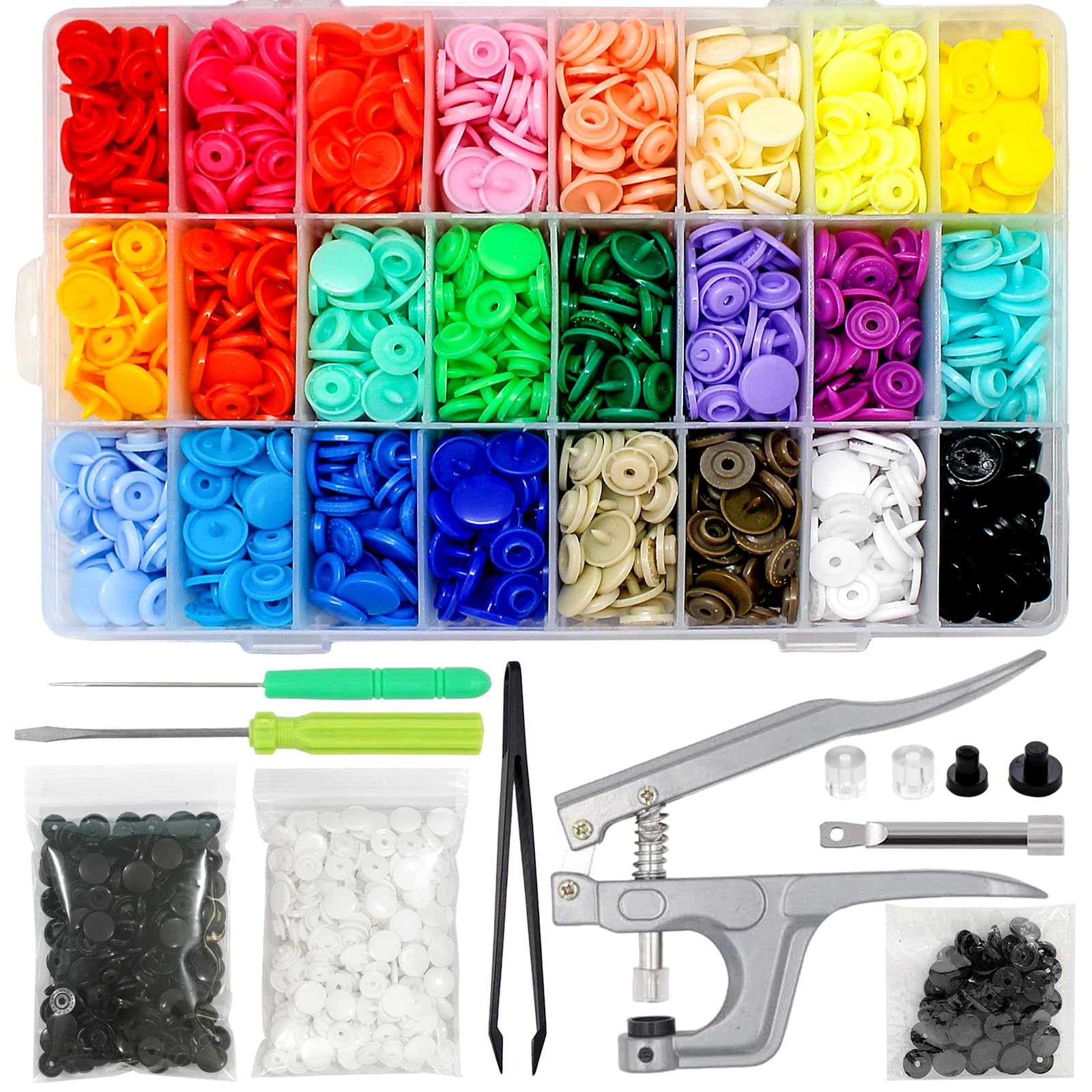 - A COMPLETE SET: Our sophisticated snap fastener kit includes a set of snaps pliers and 360 pcs of T5 snap buttons. Each snap has a male and a female button and 24 colours in total with each colour having 15 sets of buttons. In addition, we have provided associated tools, as well as 10pcs sewing clips and 1pcs measuring tape for sewing (Random color).