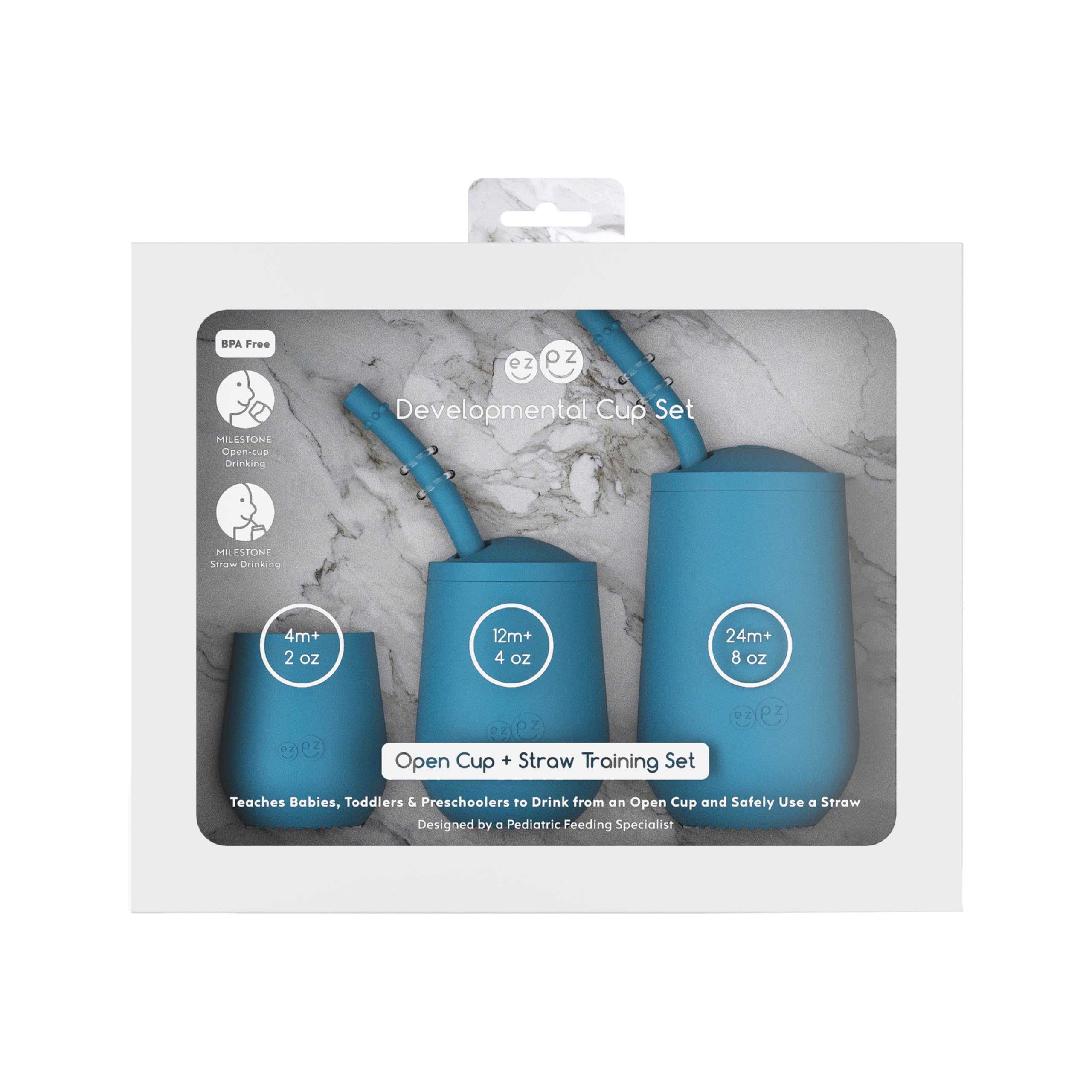 THOUGHTFULLY DESIGNED: The Mini Cup + Straw teaches older babies / toddlers to drink from an open cup and safely learn to use a straw. The straw serves as a Beginner Training Straw + an Advanced Training Straw, and the straw length and diameter are designed for straw introduction. Sensory bumps keep the infant / toddler’s lips at the tip of the straw, and the weighted base provides topple resistance. DESIGNED + TESTED BY A PEDIATRIC FEEDING SPECIALIST: All ezpz products are designed to help children meet milestones safely and effectively. The Mini Cup + Straw helps toddlers succeed with open cup and straw drinking milestones. WHY STRAW DRINKING IS IMPORTANT: Learning to drink from a straw is an important developmental milestone that develops lip rounding, supports the development of a mature swallow, and promotes speech development. Upgrade from the limitations of sippy cups to encourage these crucial developmental milestones. QUALITY MATERIAL: The Mini Cup, Lid and Straw are made from food-grade silicone that is BPA, BPS, PVC, latex and phthalate free. Soft silicone reduces potential injury to developing gums and teeth. EASY TO USE: The Mini Cup + Straw can be introduced at 9+ months depending on your child’s readiness. All components are dishwasher safe and safe to use with cold, warm and hot foods and liquids.