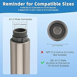 G1/2 or 13/16 Inch Male Connector: The Hibbent faucet head features a male thread with an outer diameter of 13/16 inch (20.5 mm), and the inner diameter is 0.6 inch. Designed for standard pull-out faucets, it fits most applications but may not be compatible with certain specific brands. Please check both the thread size and inner diameter before ordering to ensure a proper fit Easy Change Between 2 Modes: The faucet spray head offers a stream mode for everyday use and a powerful spray mode for effectively flushing away food debris and cleaning dishes. Simply press and release the button on back of the head to switch between 2 modes Premium Quality & Well Made Construction: The pull-out faucet spray head is crafted from high-grade engineering plastic (PC/ABS) with an industry-leading Brushed Nickel finish. It boasts exceptional durability, scratch resistance, and long-lasting performance. Please note the product color is Brushed Nickel—we recommend carefully checking this against your expectations and existing faucets before purchasing to ensure a match Easy to Install: Standard style design; It's very easy to install this pull out faucet spray head, simply unscrew your old shower head and replace it with your new one to transform your kitchen. Note: Please ensure that your faucet has a groove for the raised thread before placing your order Functional and Stylish Pull Out Head Replacement Parts: This pull out head is a sleek and functional replacement for the broken or clogged one that came with the faucet, you don't need to buy the whole set up. Please note this product is only compatible with pull-out faucets and not compatible with Pfister or Franke faucets. We strongly recommend confirming your faucet's compatibility before purchasing