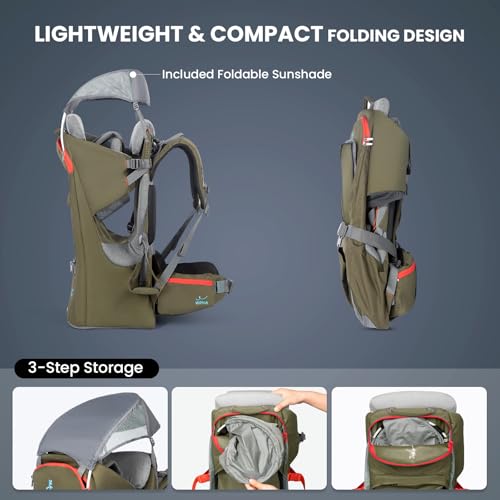 - 𝐒𝐓𝐑𝐎𝐍𝐆 𝐘𝐄𝐓 𝐋𝐈𝐆𝐇𝐓𝐖𝐄𝐈𝐆𝐇𝐓: Compact and lightweight without sacrificing its durability - Our supportive child backpack carrier is constructed with a strong collapsible aluminum frame, adding to the sturdiness and ensuring adequate support for your baby. This toddler backpack carrier could be easily folded for easy transport and space-saving storage. A long-term hiking companion for you and your little one!