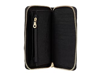 recycled polyester, excluding trims. and liner made from recycled post-consumer water bottles RFID blocking layer keeps card data protected Exposed metal zipper & Internal zippered coin pocket External rear storage sleeve Multiple card slots and currency sleeves