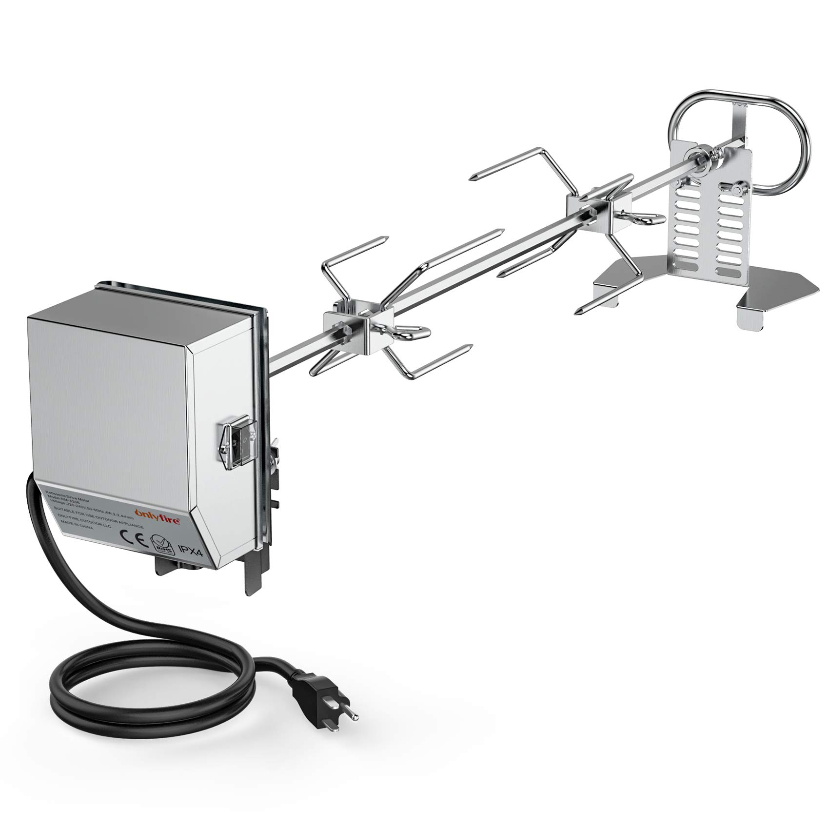 Dreyoo Kit de Asador Rotisserie Universal, Certificación UL Asador Rotisserie Automático Giratoria con Motor 120V 4W, Varilla de Asado de 28'', 2 x 4 Tenedores, Soportes y Tornillos de Fijación Completos para Asadores de Jardín y Camping